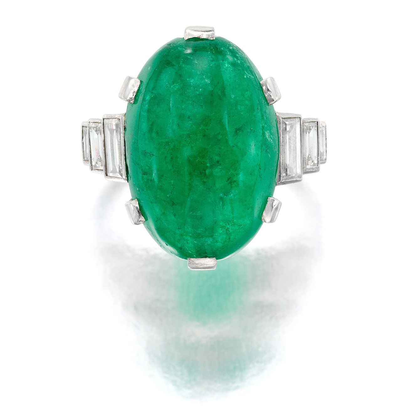 Set with a drilled oval cabochon emerald, between baguette diamond shoulders, mounted in platinum, size 7, French assay mark for platinum and maker's mark.