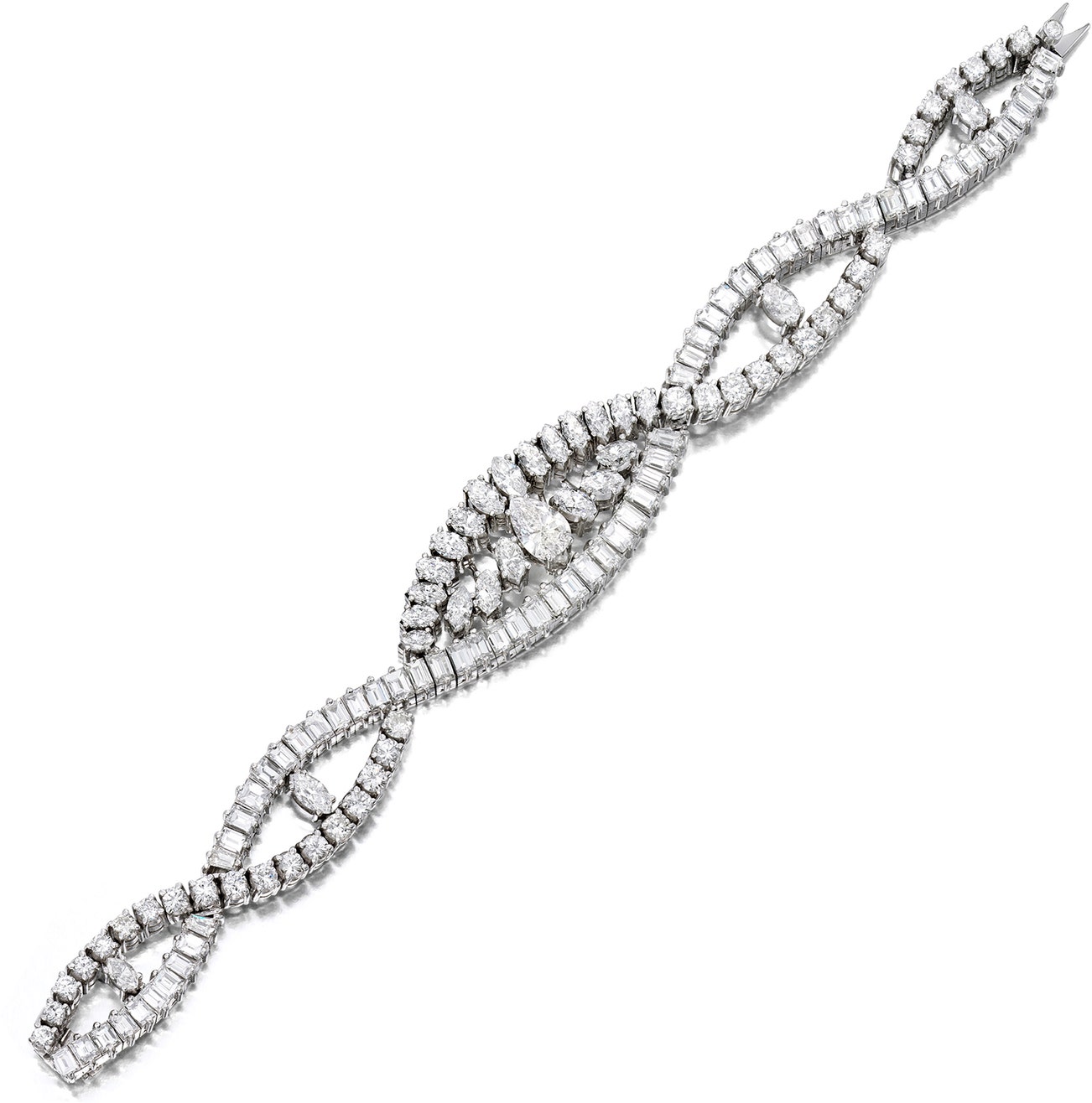 Composed of two interlaced rows of diamonds, one set with baguette diamonds, the other with brilliant-cut and marquise-shaped diamonds, the center set with a pear-shaped diamond, further accented by marquise-shaped diamonds, mounted in platinum, length approximately 7 inches.