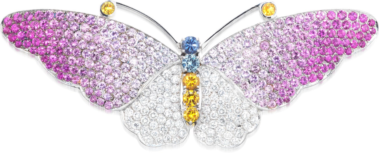 Designed as a butterfly, set with circular-cut pink, yellow, blue sapphires and brilliant-cut diamonds, mounted in white gold, can be worn as a pendant, two diamonds deficient.