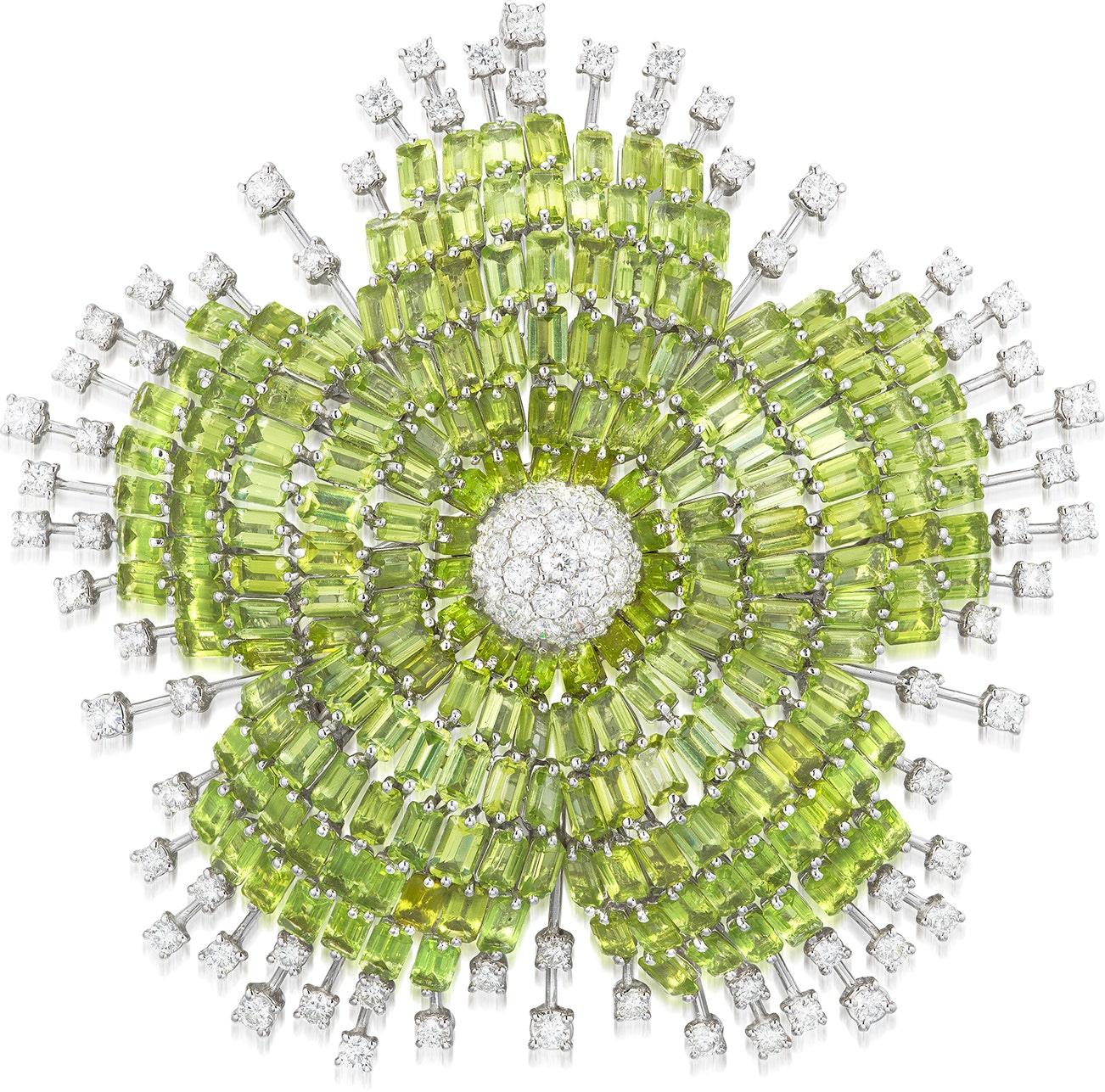 Designed as a flowerhead, set at the center with brilliant-cut diamond of bombé design, and rectangular step-cut peridot petals, further enhanced with brilliant-cut diamonds, mounted in platinum, can be worn as a pendant.