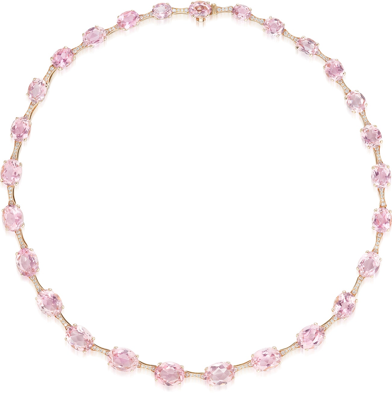 Composed of a series of graduated oval pink tourmaline, alternating with diamond-set link, mounted in pink gold, length approximately 607 mm.