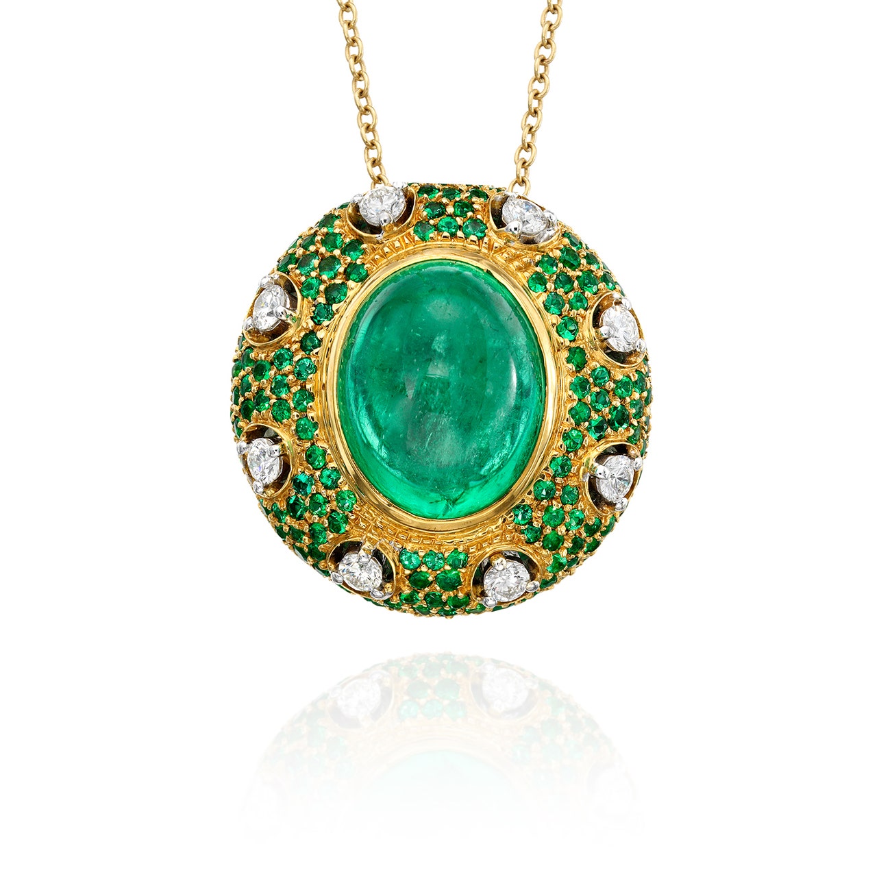 Set with an oval cabochon emerald, edged by a halo of circular-cut emeralds, accented by brilliant-cut diamonds, mounted in 18K yellow and white gold, Italian maker's mark and assay mark for 18k gold, suspended from a gold chain in 18k gold, with Italian assay mark for 18k gold, length approximately 17 1/4 inches.