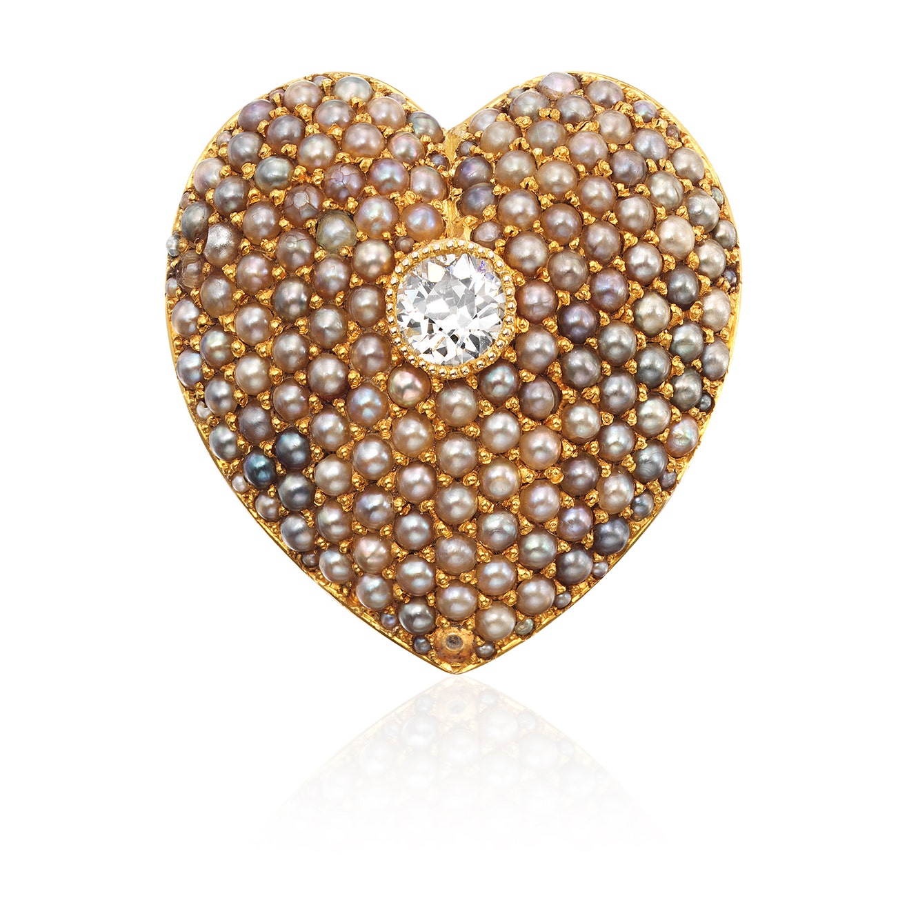 Modelled as a heart, set with a circular-cut diamond, accented by seed pearls, mounted in 14k yellow gold, length approximately 1 1/8 inches.
