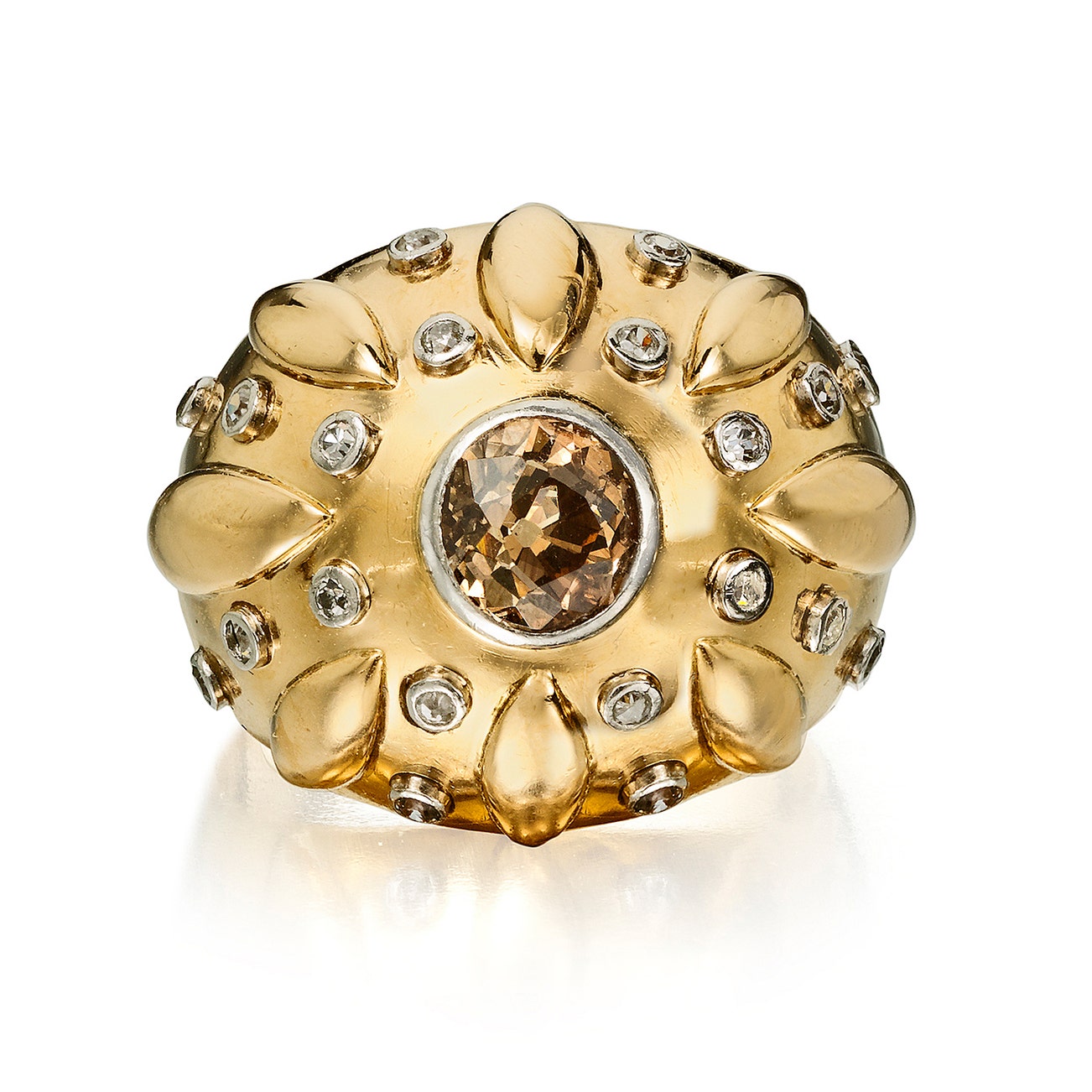 Set with a circular-cut diamond of brown tint, accented by near-colorless single-cut diamonds, mounted in 18k yellow gold, size 7.5, with French import marks for 18k gold.