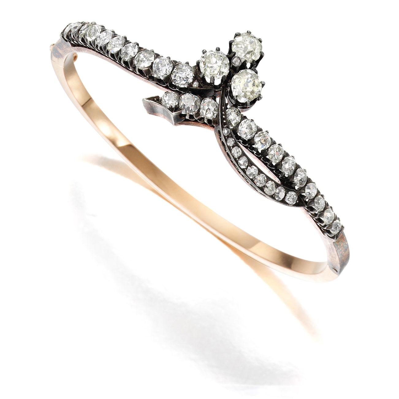 Designed as a two old-cut diamond lines joined by a cushuions-shaped diamond clover, mounted in silver topped 18k rose gold, inner circumference approximately 6 1/2 inches, French import marks for 18k gold.