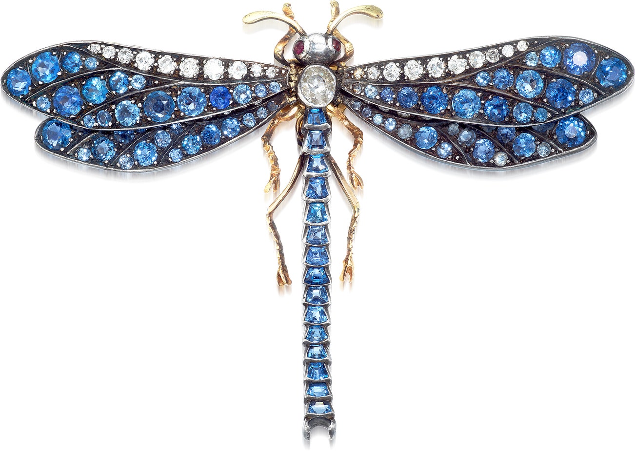 Designed as a dragonfly, set with circular and calibré-cut blue sapphires, circular-cut and brilliant-cut diamond and cabochon rubies mounted in oxidized white gold and gold.