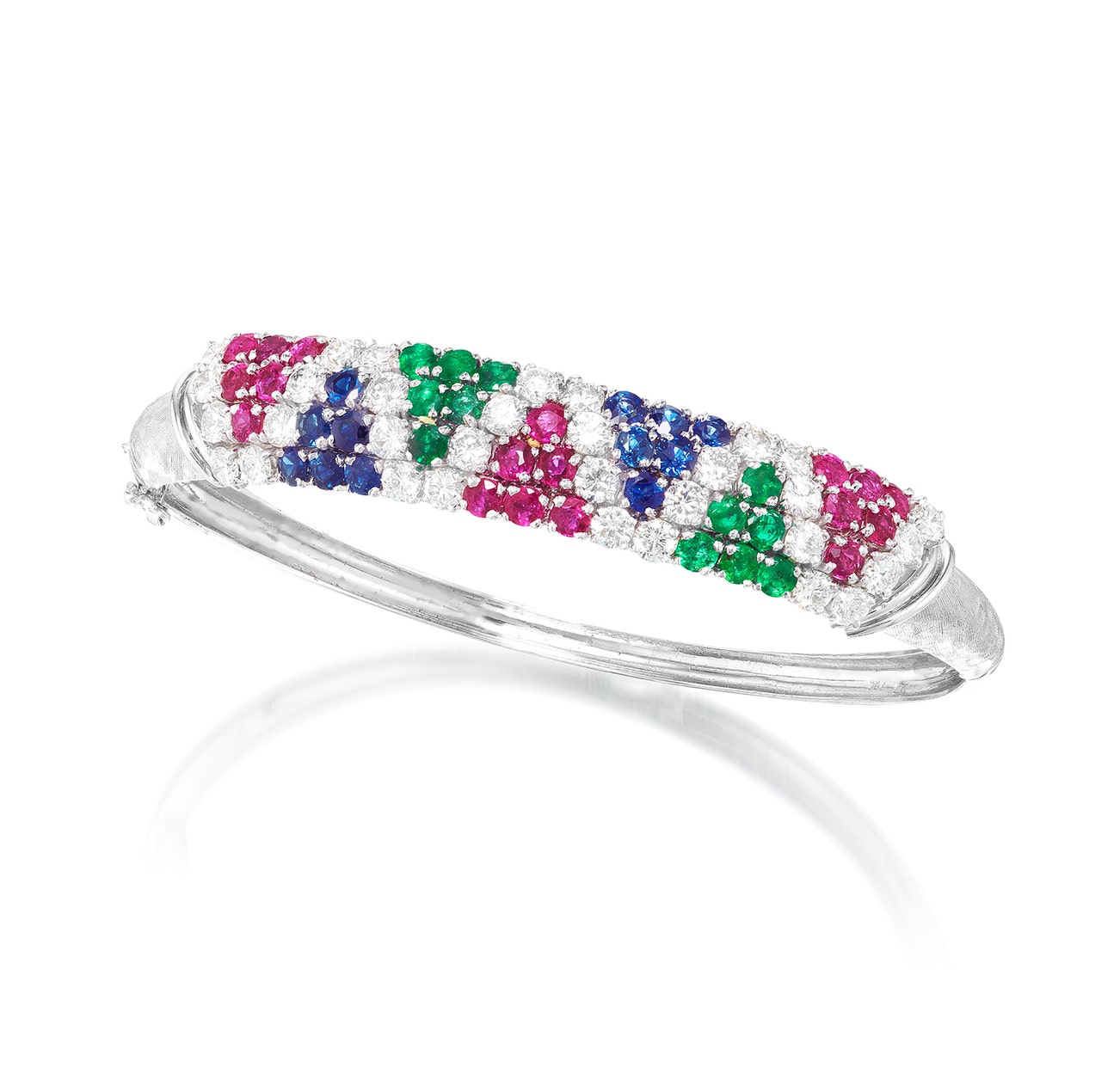 Designed as a hinged bangle, the top set with circular-cut rubies, sapphires, emeralds and brilliant-cut diamonds, mounted in white gold, inner circumference approximately 174mm.