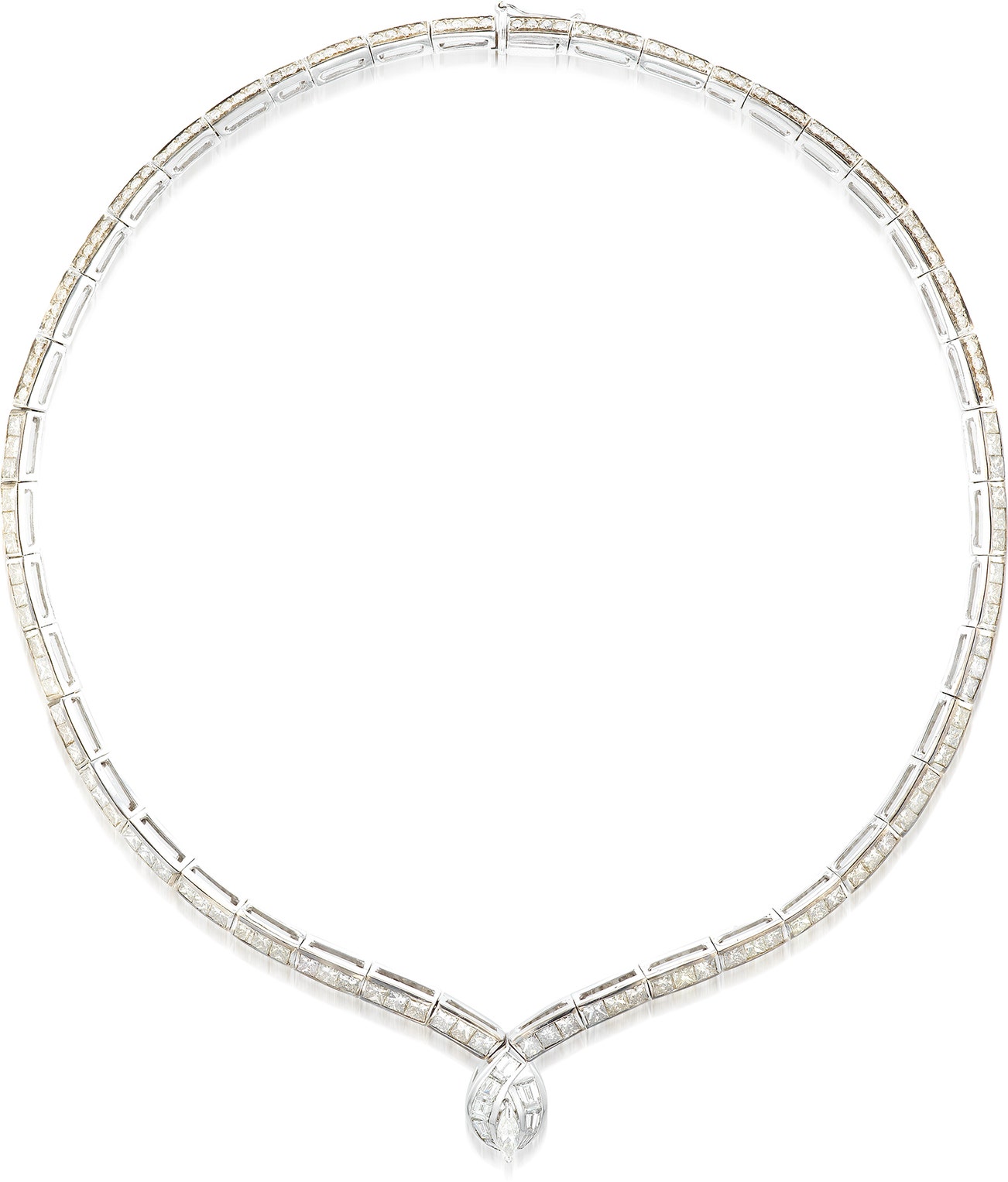 The front set with marquise-shaped diamond within a calibré-cut diamond surround, the necklace composed of a series of collet links set with square-cut diamonds and brilliant-cut diamonds, mounted in white gold, necklace length approximately 390 mm.
