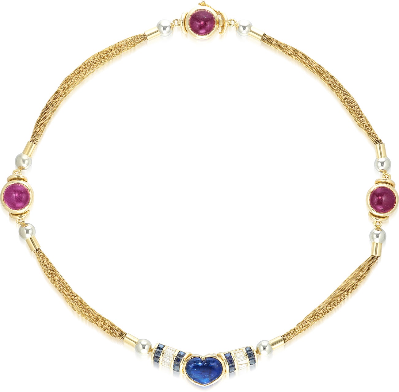 The front set with a heart-shaped sapphire collet, between calibré-cut diamonds and sapphires, the necklace set with three oval ruby collets, spaced by multi strands of fine gold link chain, further accented by gold details, mounted in gold, necklace length approximately 409 mm.