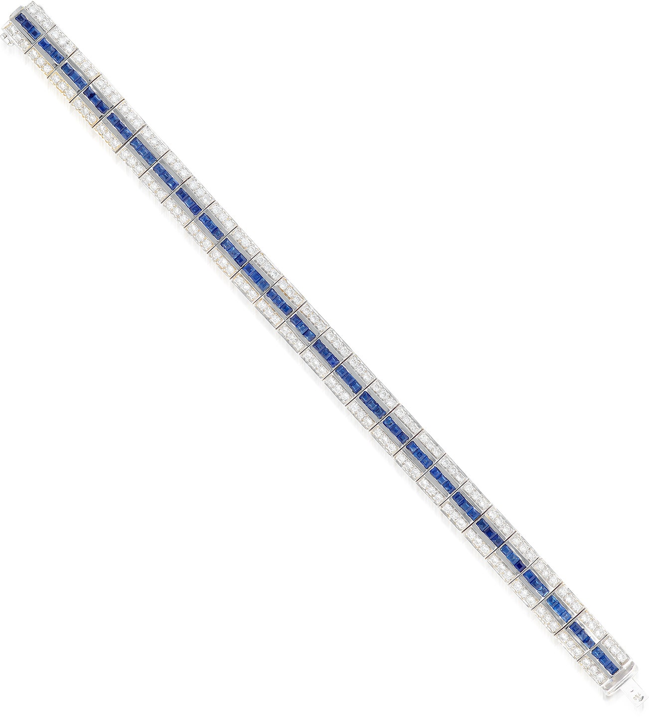 Composed of a series of articulated slinks, each link set at the center with a line of square-cut sapphires, flanked by brilliant-cut diamonds, mounted in white gold, length approximately 186 mm.