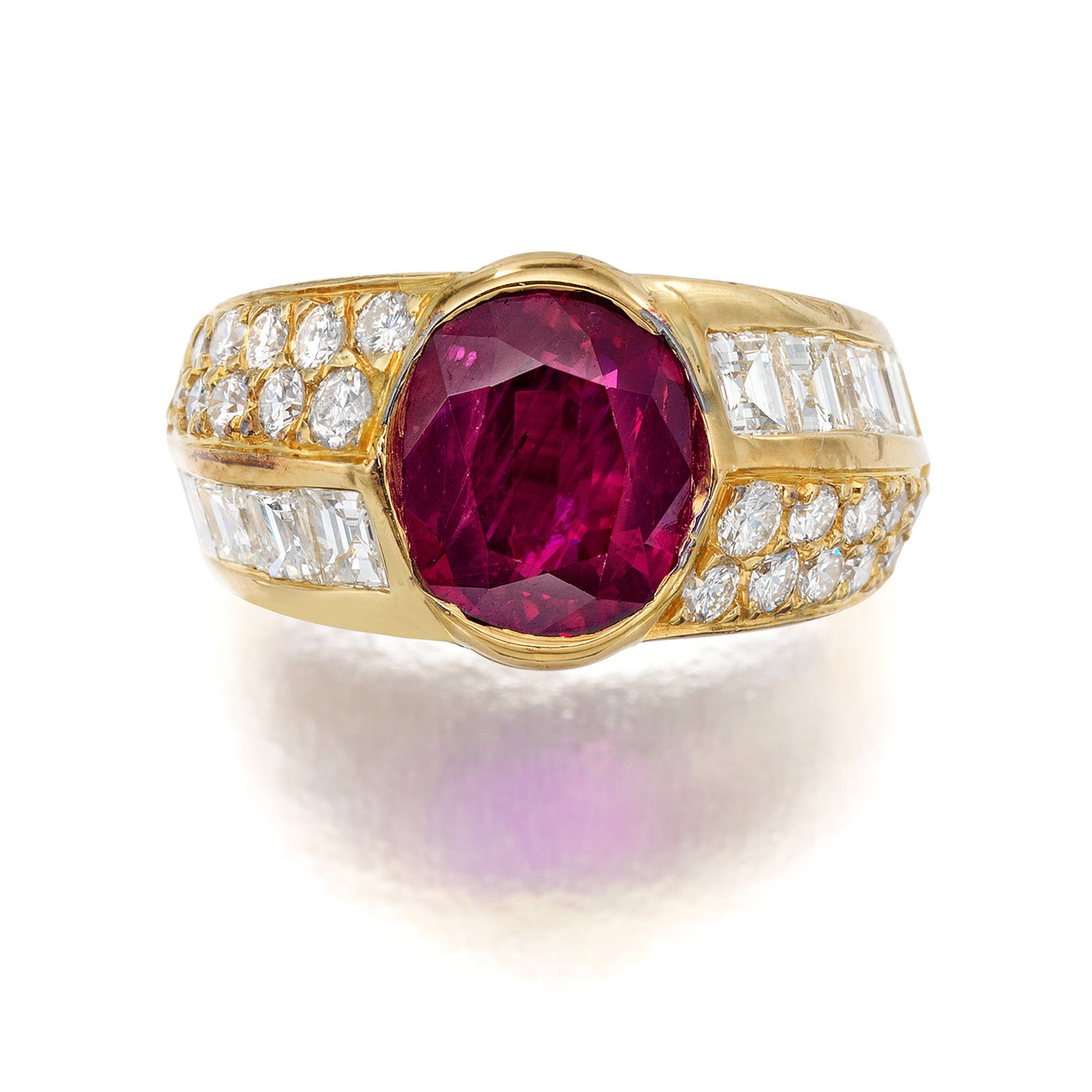 Set with an oval ruby weighing 3.47 carats, accented by brilliant-and step-cut diamonds,