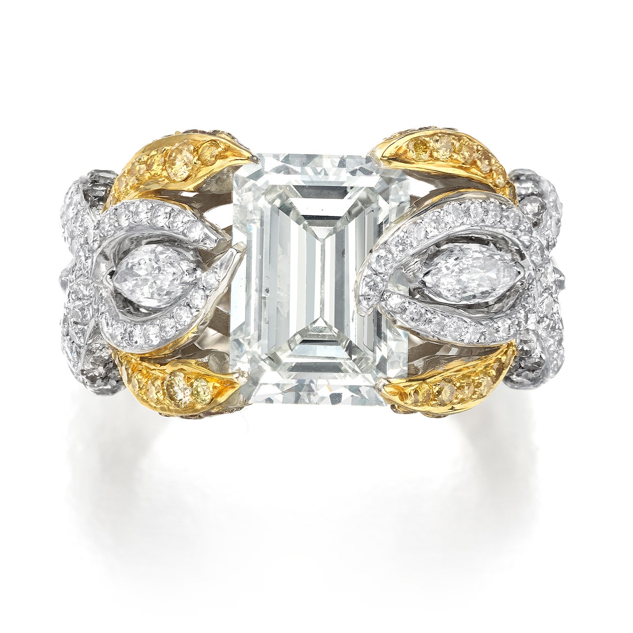 Set with an step-cut diamond ring stated to weigh 4.12 carats, accented by marquise-shaped diamonds and brilliant-cut diamonds of yellow and brown tint, and near colorless, mounted in 18k white and yellow gold, size 6.25.