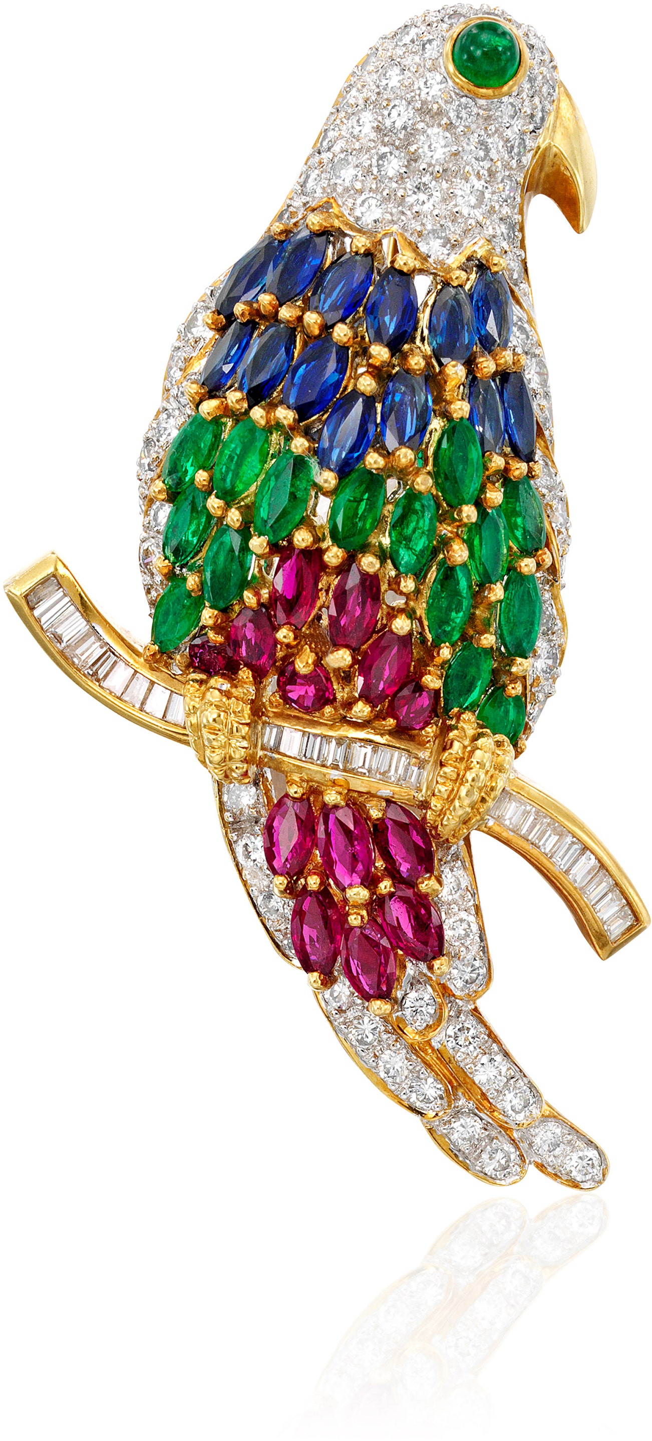 Modelled as a parrot, set with marquise- and pear- shaped sapphires, emeralds, and rubies, with a cabochon emerald eye, accented by brilliant-cut and baguette diamonds, mounted in 18k yellow and white gold.