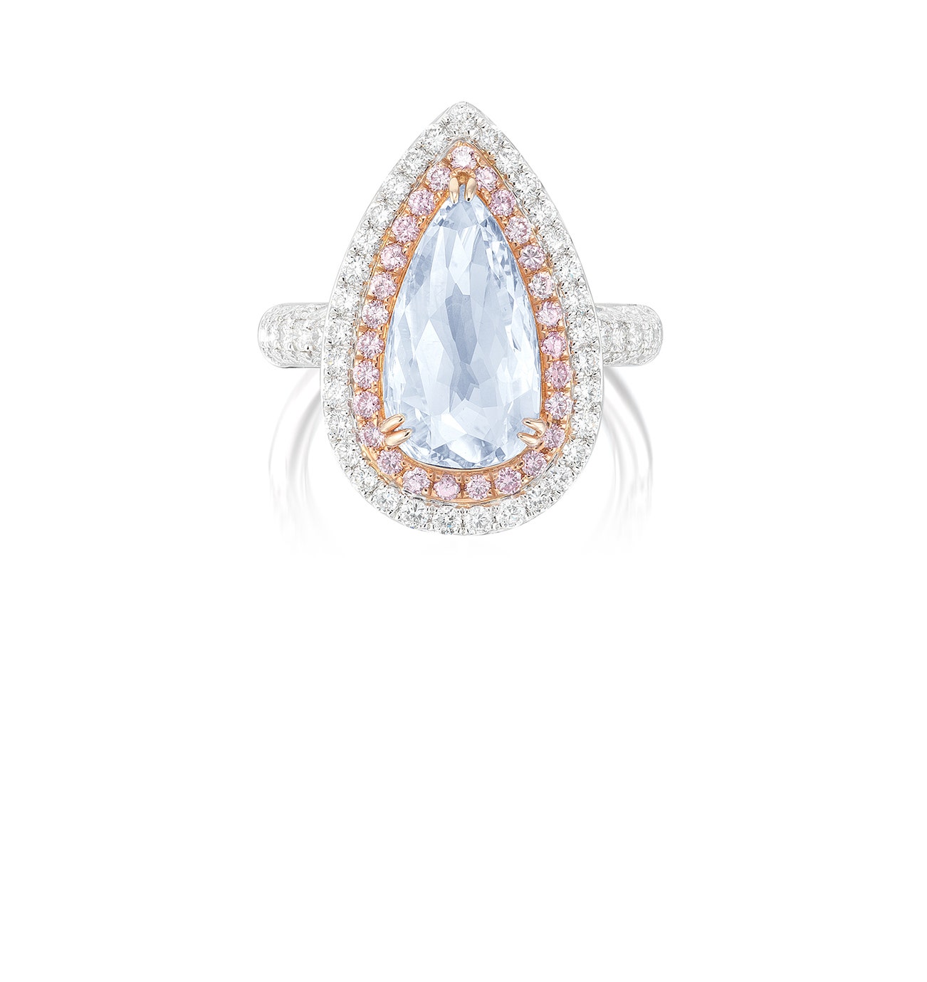 Set with a pear rose-cut very light blue diamond, weighing approximately 3.01 carats, within a frame of brilliant-cut diamond of pink tint, and a brilliant-cut diamond surround, mounted in platinum and pink gold, size 6.