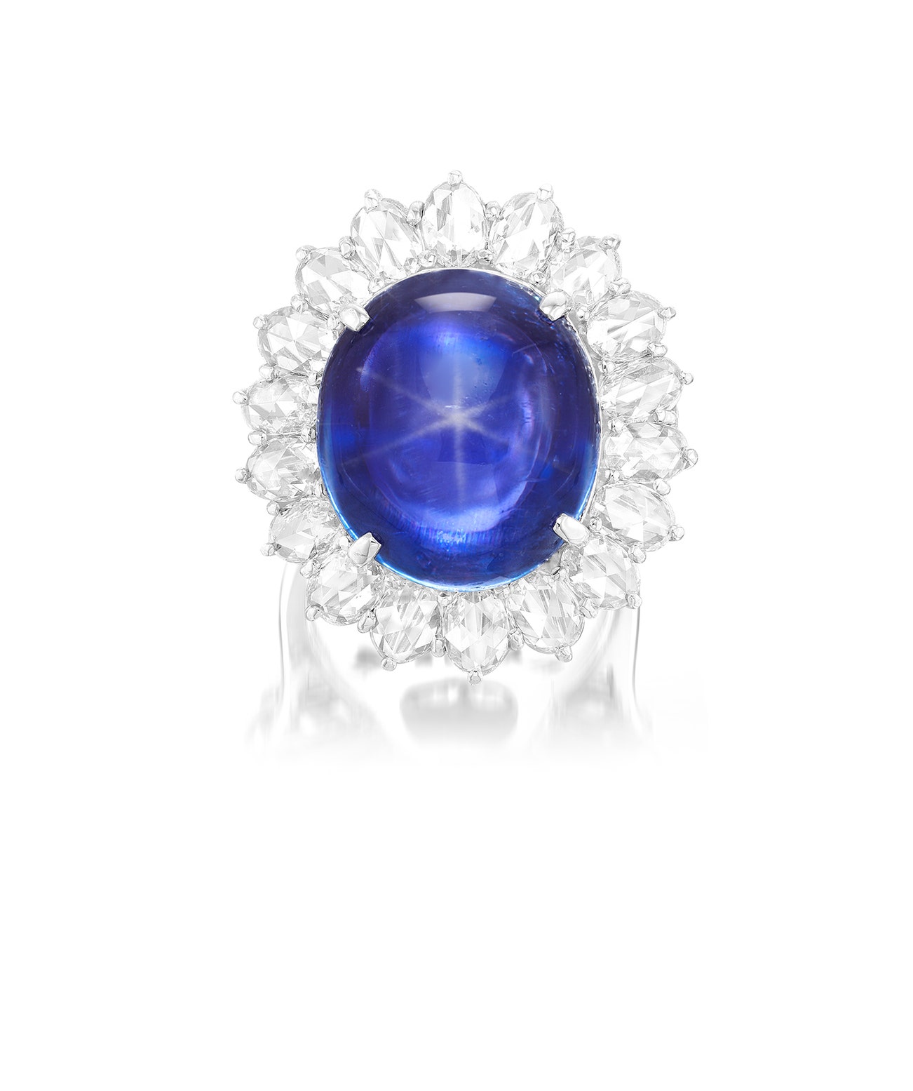 Set with a double cabochon colour-change star sapphire weighing approximately 20.49 carats, within an oval rose-cut diamond surround, mounted in platinum, size 6¼.