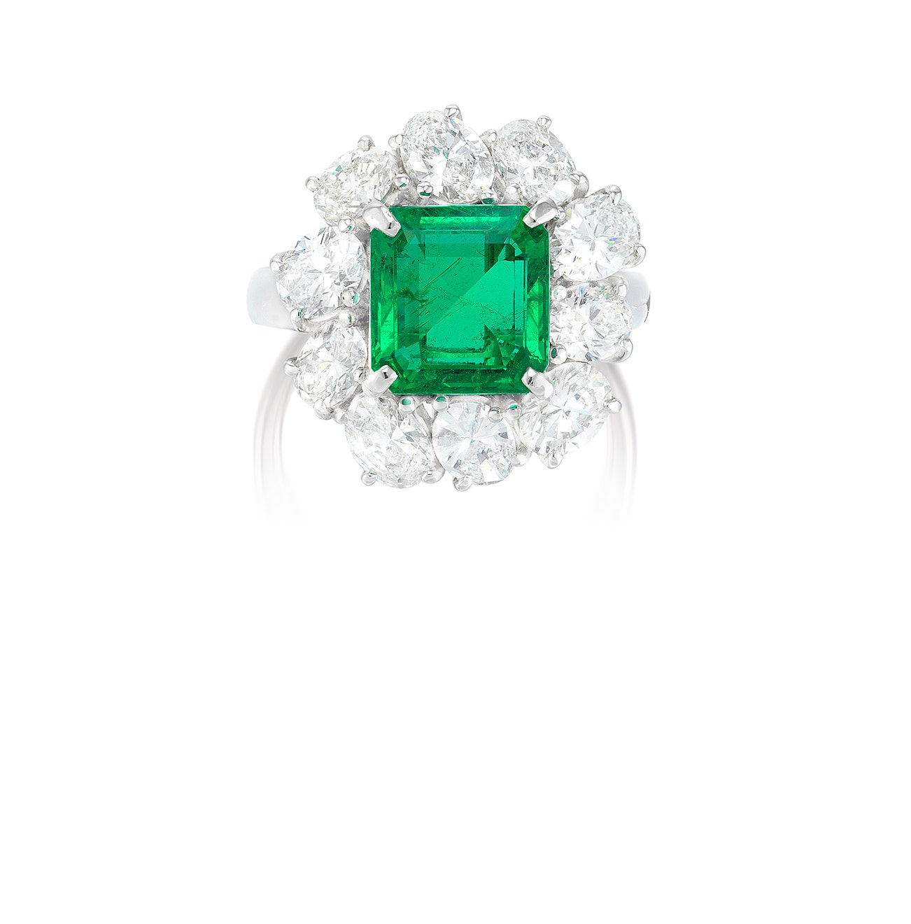 Set with an octagonal step-cut emerald weighing approximately 3.05 carats, within an oval diamond surround, mounted in platinum, size 6¼.