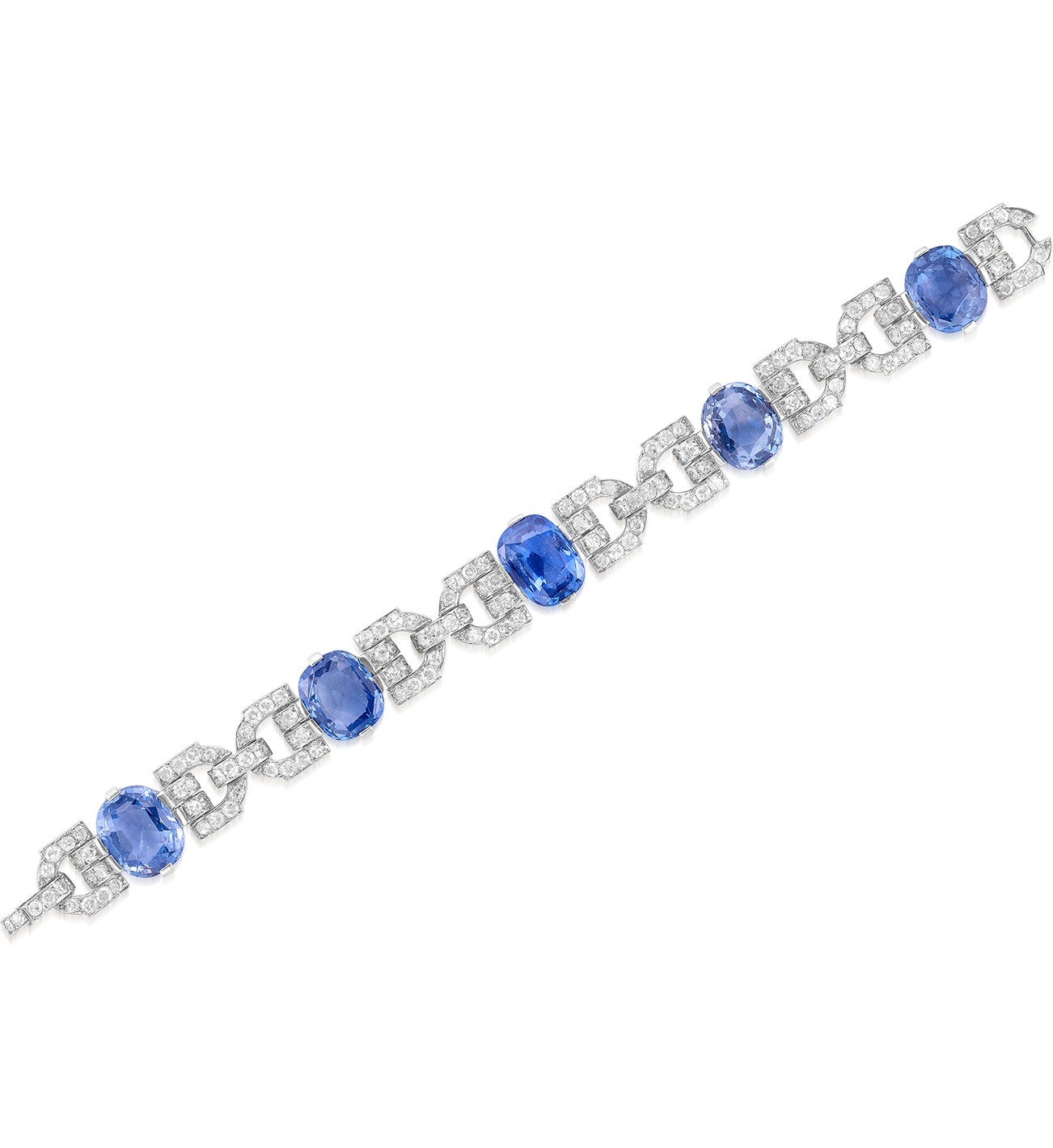 Set with oval and cushion-shaped sapphires, connected by links set with circular-cut diamonds, mounted in platinum, numbered, French assay mark, maker's mark, length approximately 155 mm.