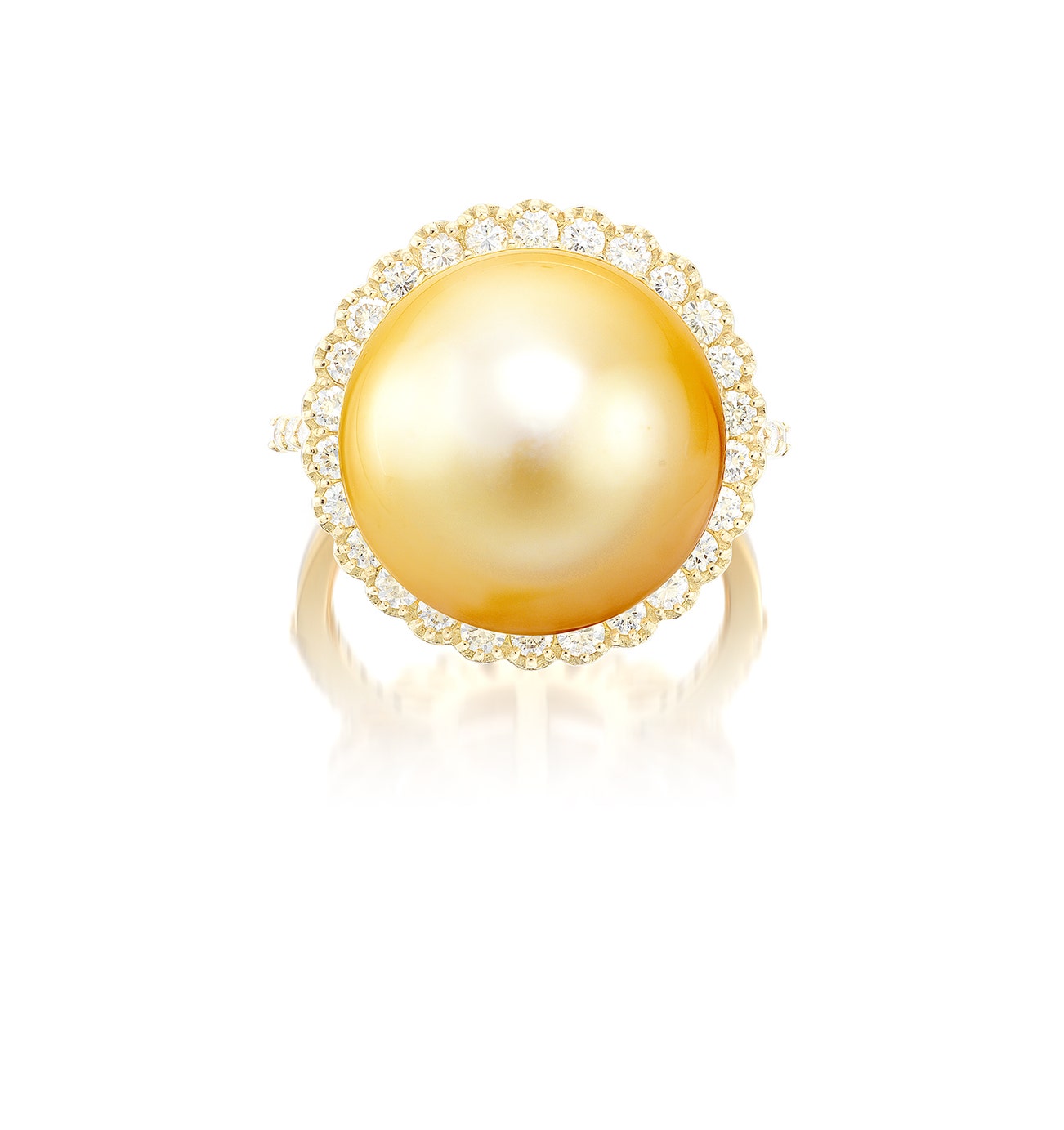 Set with round golden cultured pearl measuring approximately 15.00 x 15.03 mm, within a brilliant-cut diamond surround and shoulders, mounted in gold, size 6.