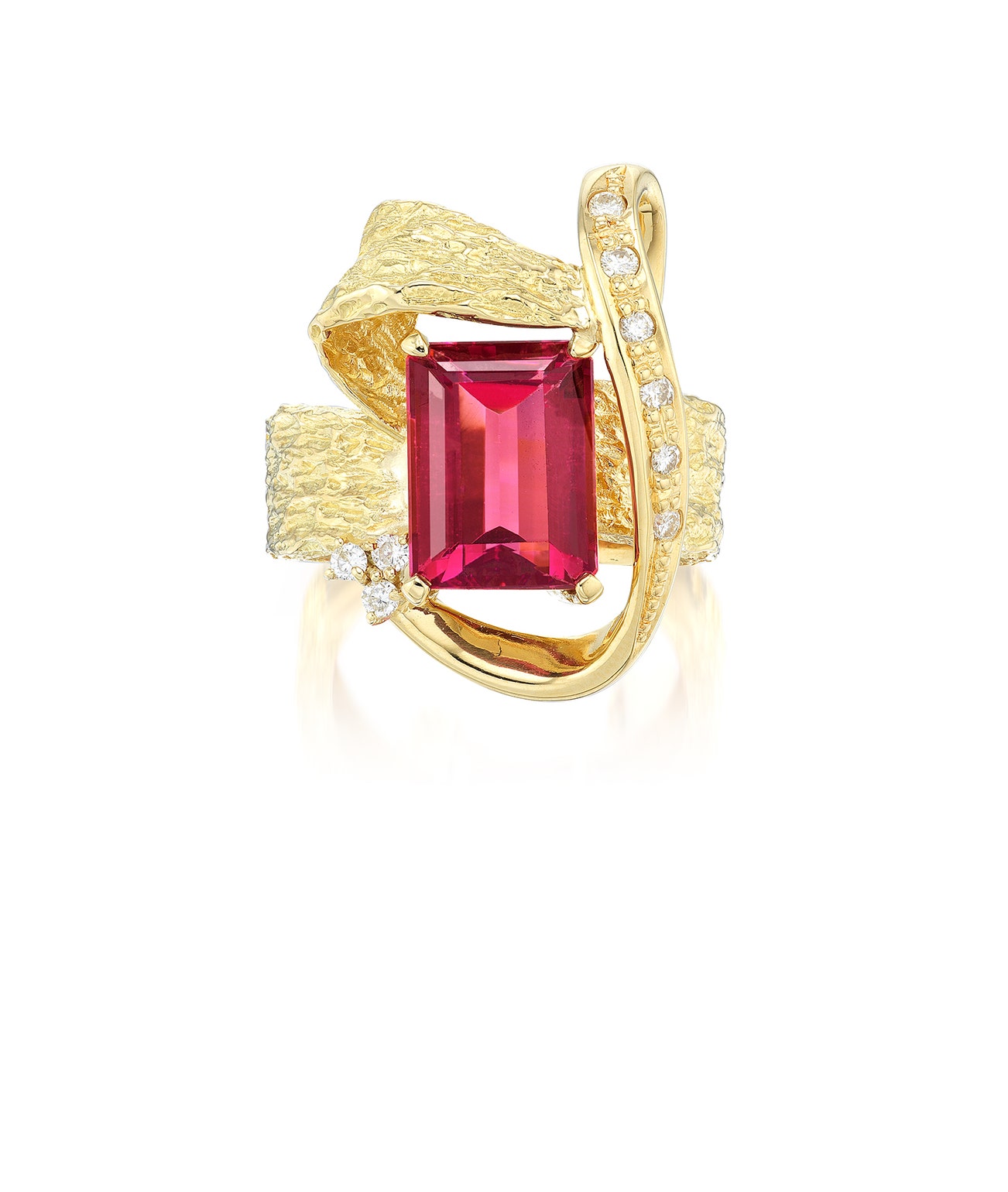 Set at the center with a rectangular-cut coloured tourmaline, enhanced by brilliant-cut diamonds and textured gold band mounted in gold, size 6¼.