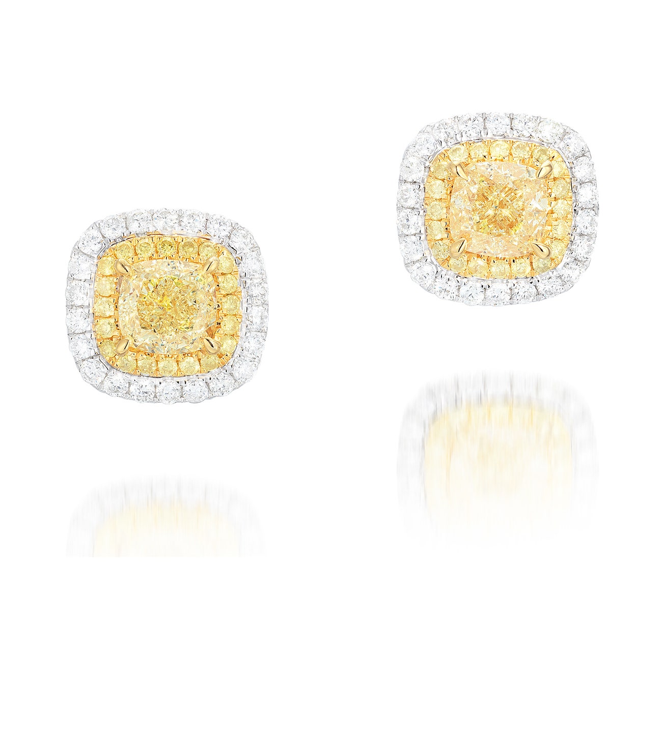 Each set with a cushion-shaped diamond, weighing approximately 1.00 carat and 1.00 carat respectively, within a frame of brilliant-cut diamond of yellow tint, and brilliant-cut diamond surround, mounted in white gold, post and butterfly fittings.