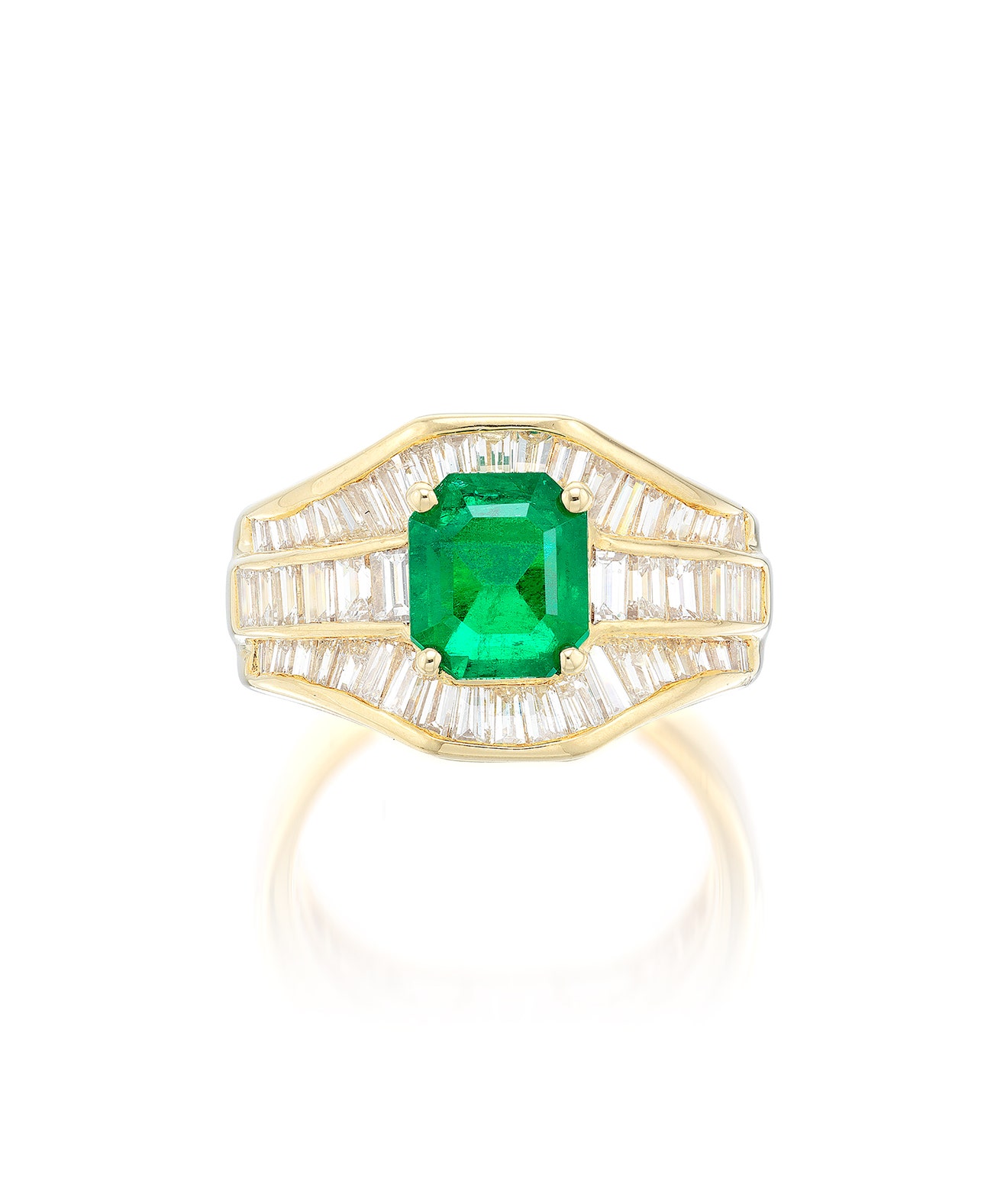 Set with an octagonal step-cut emerald stated to weigh approximately 1.77 carats, within calibré-cut diamond surround and shoulders, mounted in gold, size 6½.