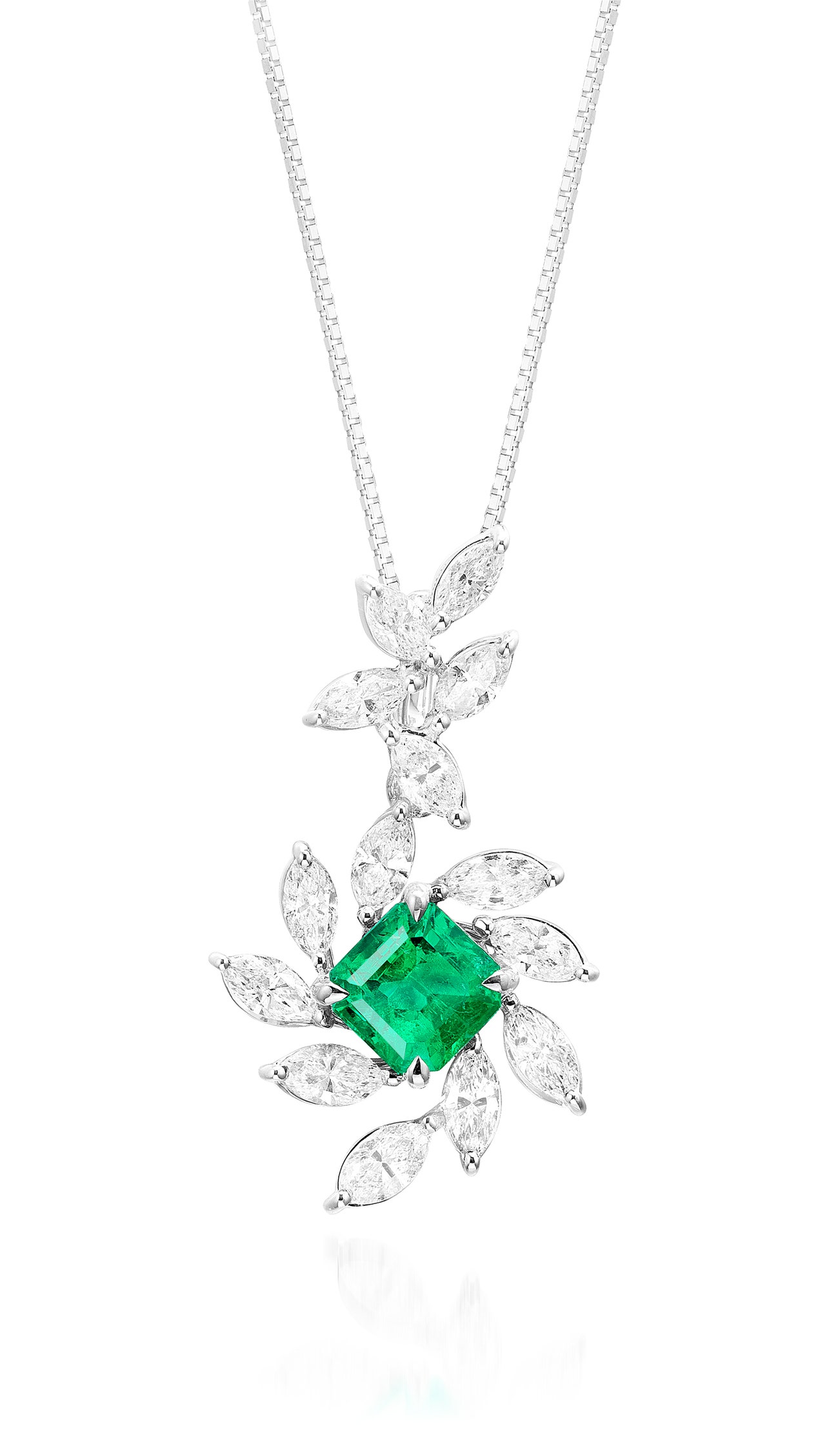 Supporting an octagonal step-cut emerald, weighing 1.40 carats, within a marquise-shaped diamond surround and surmount, mounted in white gold, neckchain length approximately 452 mm.