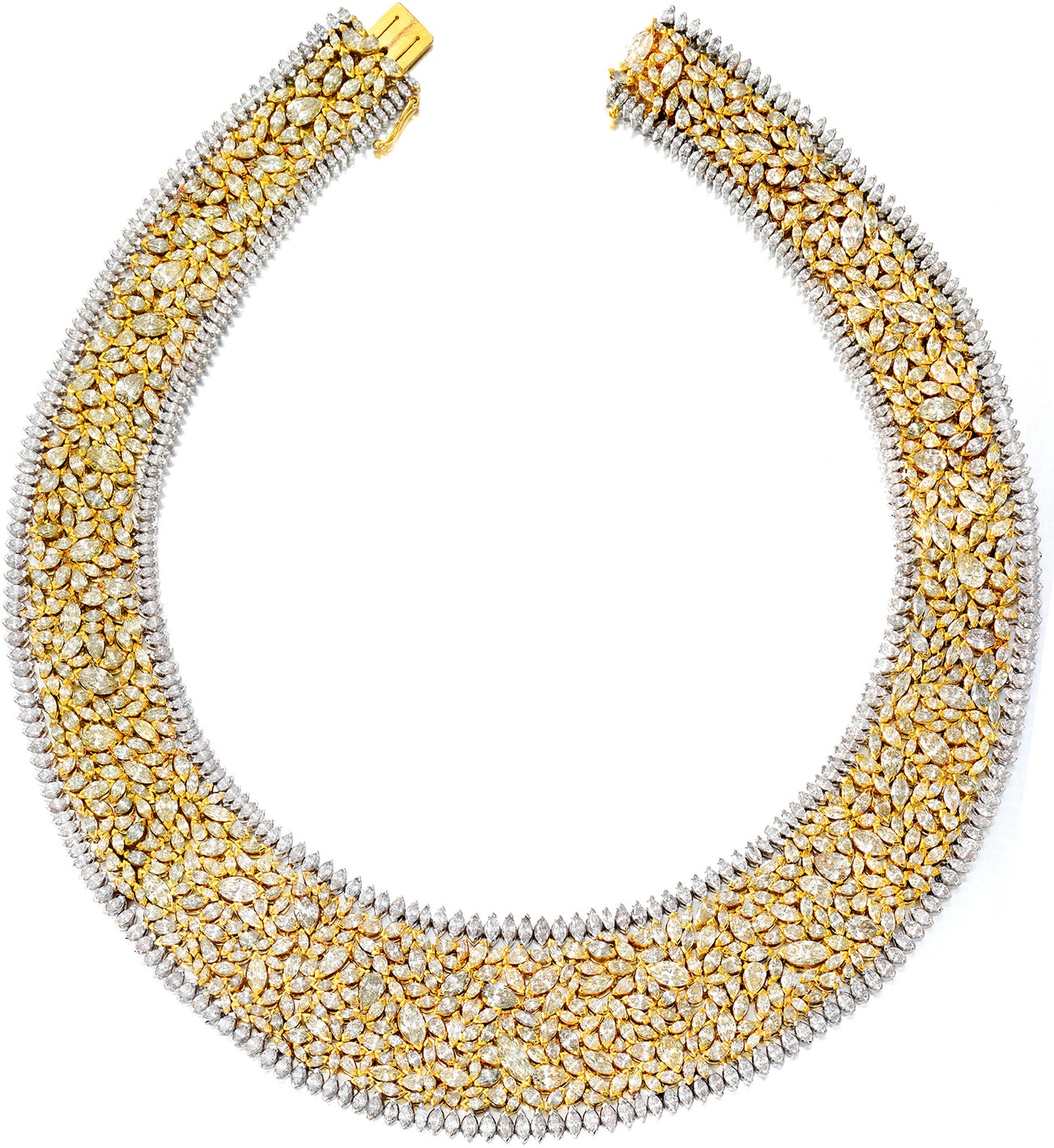 Of bib design, Set with marquise- and pear-shaped diamonds of yellow tint, edged by marquise-shaped near-colorless diamonds, mounted in 18k yellow and white gold, inner circumference approximately 15 inches.