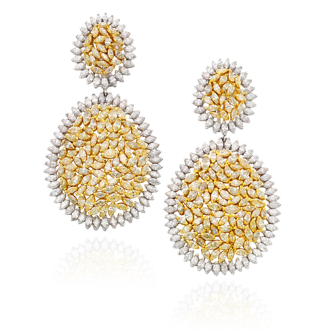 Each designed set with marquise-shaped diamonds of yellow tint, edged by marquis-shaped near colorless diamonds, suspended by similar motifs, mounted in 18k yellow and white gold, posts with hinge back fittings.
