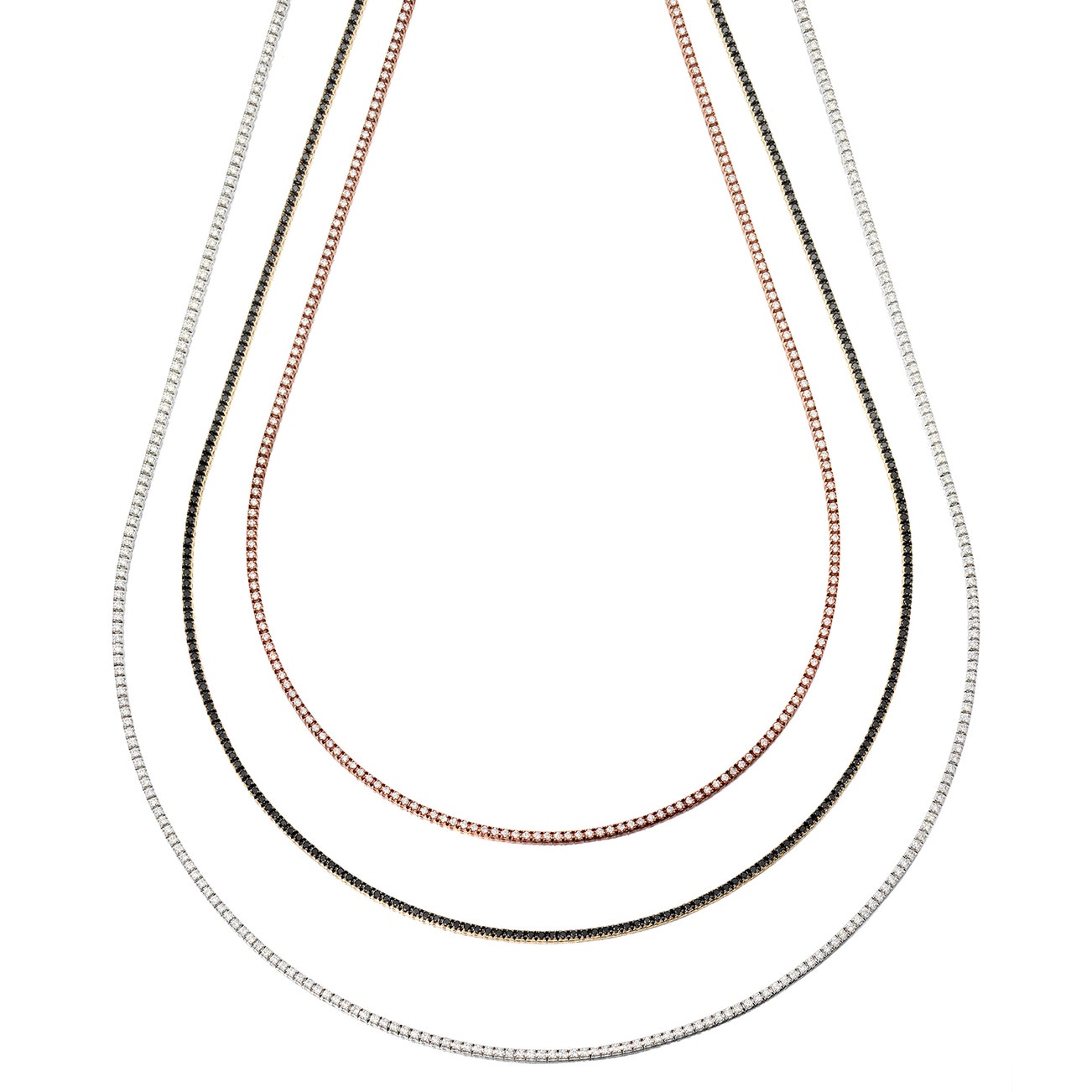 Comprising two brilliant-cut near colorless diamond necklaces, mounted in 14k white and rose gold respectively, length approximately 35 inches, and a brilliant-cut of black tint diamond necklace, mounted in 14k yellow gold, length approximately 35 1/2 inches.