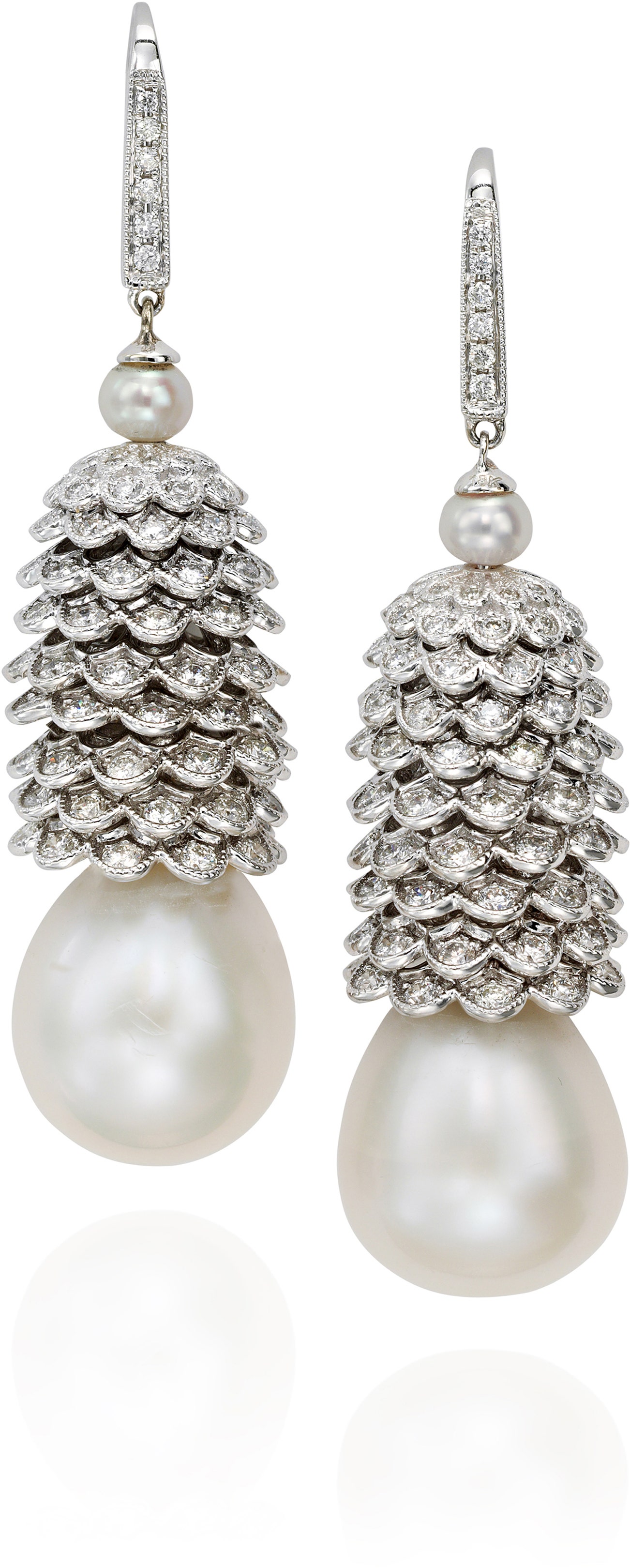 Each set with graduating scallops of brilliant-cut diamonds, suspending a drop cultured pearl, suspended by a round cultured pearl and brilliant-cut diamonds, mounted in 18k white gold, wire hook fittings.