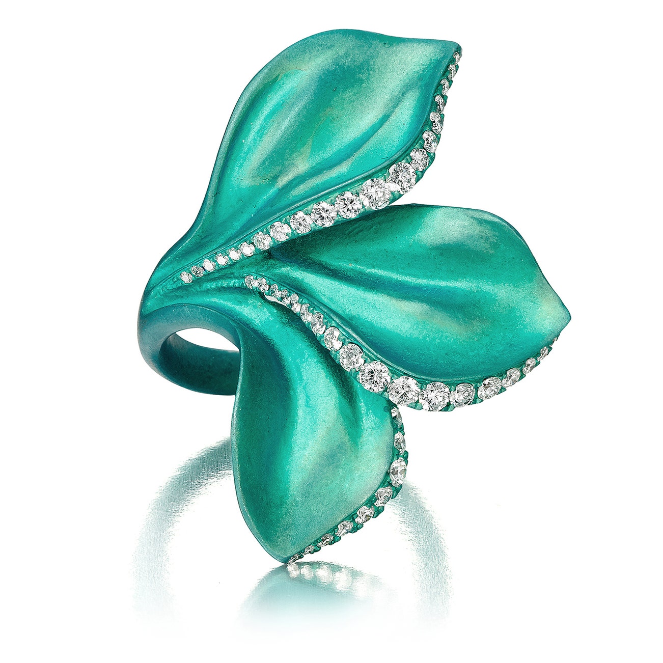 Designed as three leaves, accented by brilliant-cut diamonds,