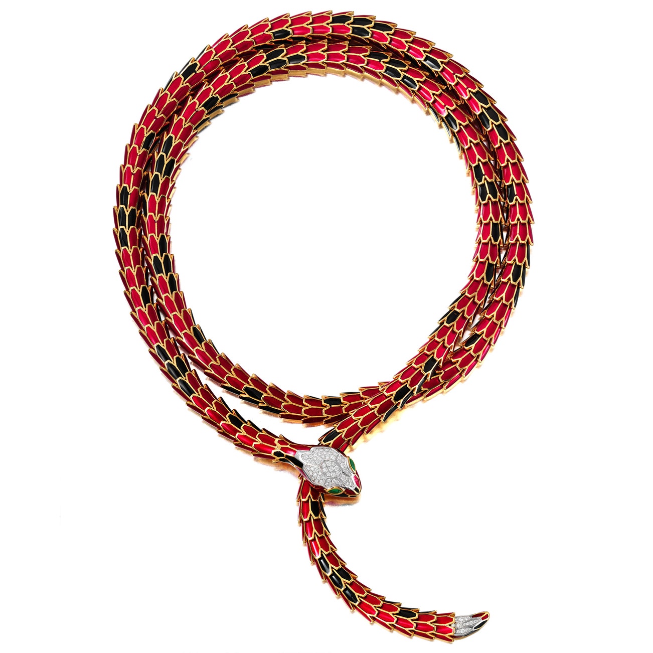 Designed as a snake with red and black scales, the head and end of tail set with brilliant-cut diamonds, with marquise-cut emerald eyes, mounted in 18k rose gold plated silver, length approximately 44 1/2 inches flexible, Italian assay marks for 18k gold and silver and maker's mark.
