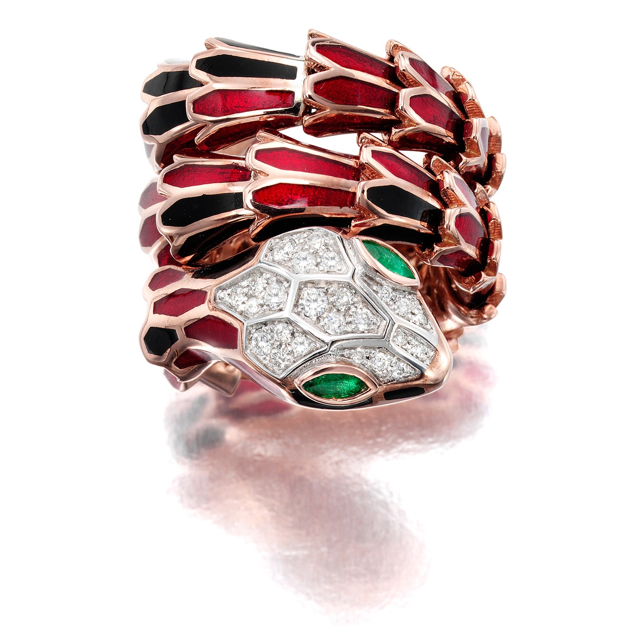 Designed as a snake with red and black scales, the head and end of tail set with brilliant-cut diamonds, with marquise-cut emerald eyes, mounted in 18k rose gold plated silver, size. 4.5 flexible, Italian assay marks for 18k gold and silver and maker's mark.
