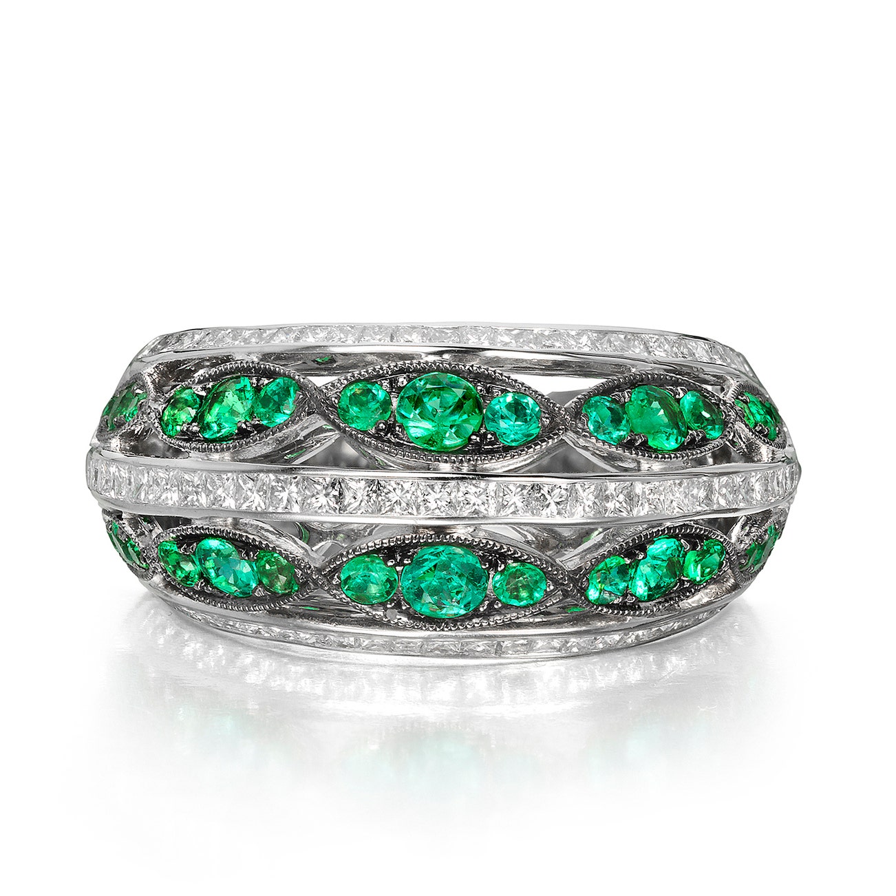 Set with alternating bands of princess-cut diamonds and circular cut emeralds,