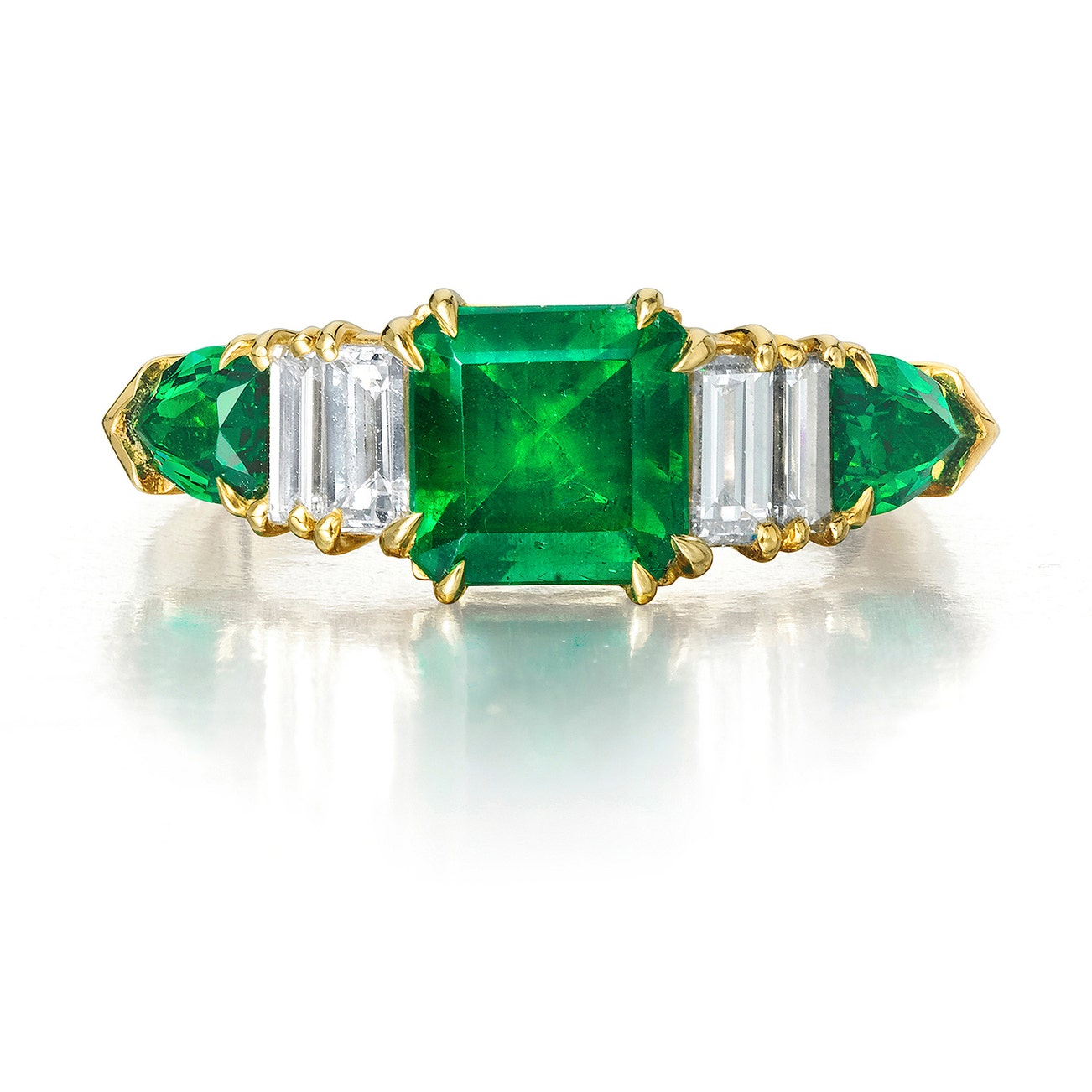 Set with a step-cut emerald weighing 1.52 carats, between baguette diamonds and pear-shaped emeralds,