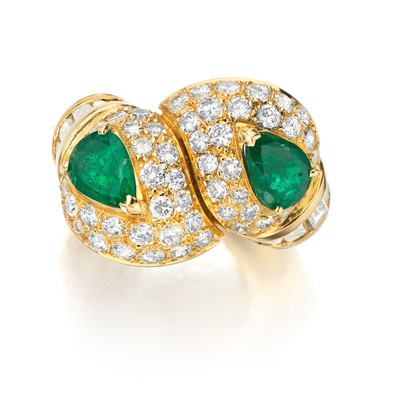 Of cross-over design, each side set with a pear-shaped emerald, accented by brilliant-cut, baguette, and tapered baguette diamonds, mounted in 18k yellow gold, size 7.