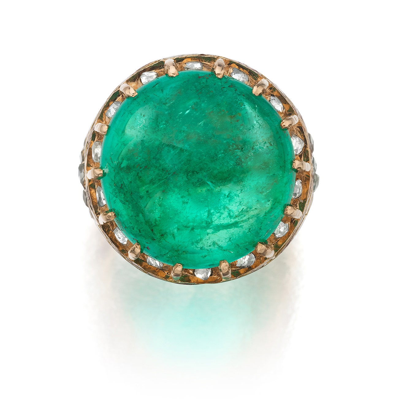Set with a cabochon emerald weighing 17.07 carats, accented by rose-cut diamonds and enamel, mounted in 14k rose gold, size 5.