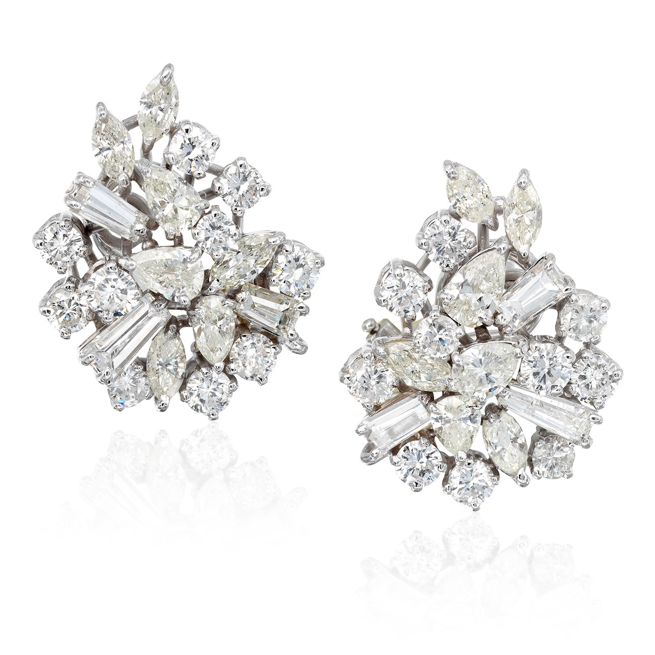 Of cluster design, set with brilliant-cut, pear-, marquise-shaped, and baguette diamonds, mounted in 18k white gold, posts with hinge back fittings and wire pendant hooks.
