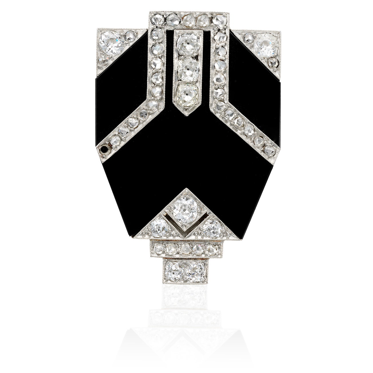 The onyx plaque accented by old- and rose-cut diamonds, mounted in platinum and 18k white gold, French assay marks for platinum and 18k gold.