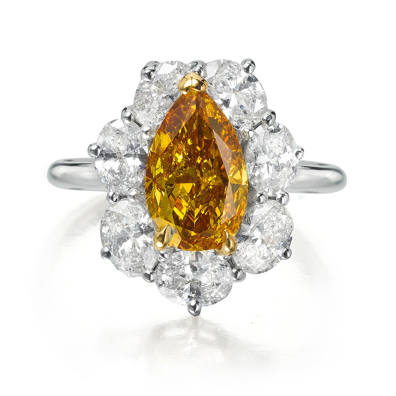 Set with a Fancy Deep Brownish Orangy Yellow pear-shaped diamond weighing 2.00 carats, surrounded by oval-shaped diamonds, mounted in 18k white gold, size 6.5.