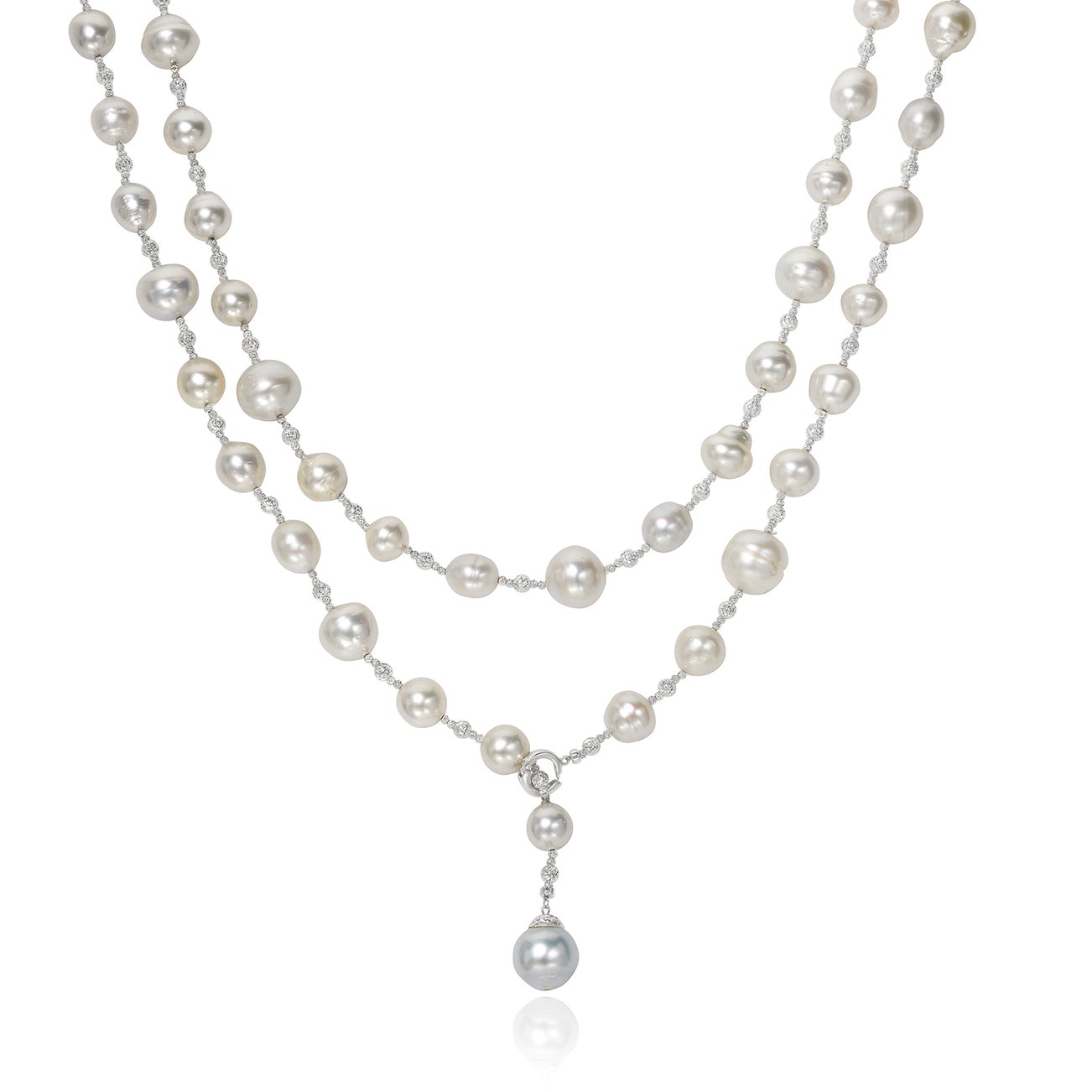 Strung with semi-baroque to near-round pearls accented by faceted gold beads,