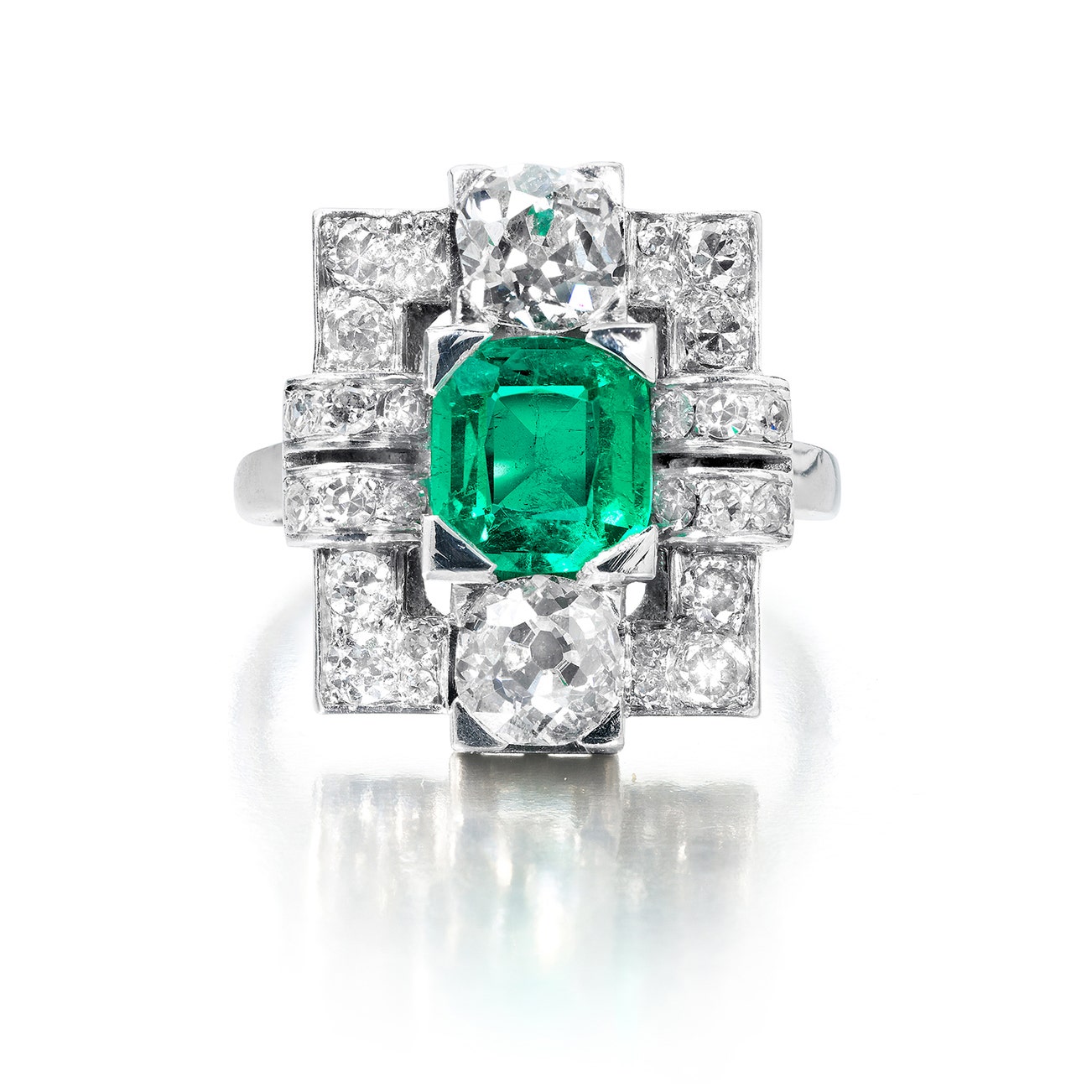 Set with a step-cut emerald weighing 1.68 carats, accented by cushion-shaped, brilliant-, and single-cut diamonds,