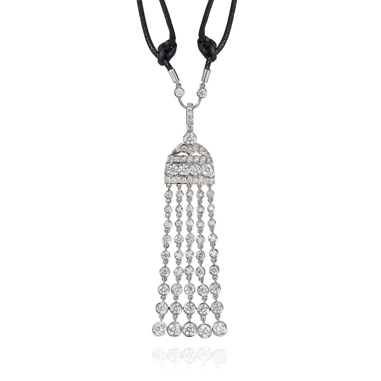 The pendant composed of brilliant-cut collect-set diamond fringe suspended by a cap accented by brilliant-cut diamonds, mounted in 18k white gold, length approximately 2 1/2 inches.