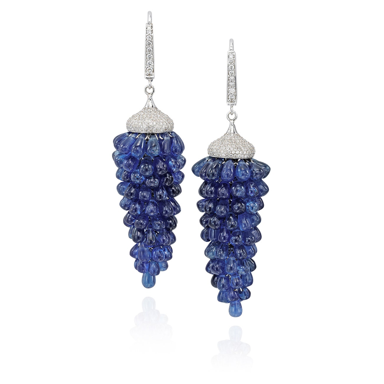 Each with a brilliant-cut diamond set cap suspending cabochon drop sapphire clusters,
