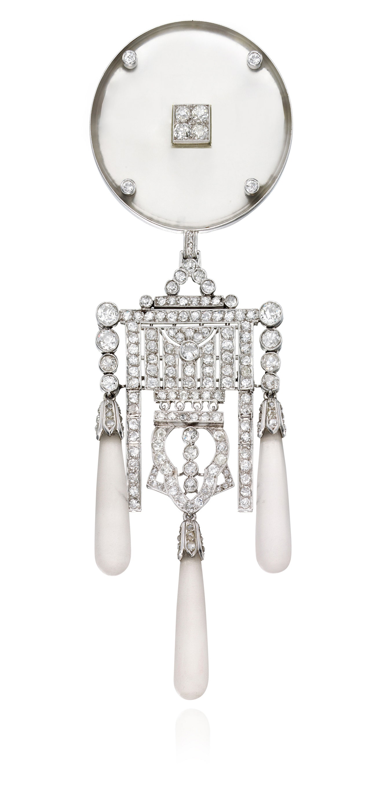 Composed of a rock crystal disc set with cushion-shaped and brilliant-cut diamonds, supporting a pendant of open work geometric design millegrain-set with cushion-shaped, circular-, single-, and rose-cut diamonds, suspending three rock crystal drops, length approximately 5 1/8 inches, French import marks for platinum.