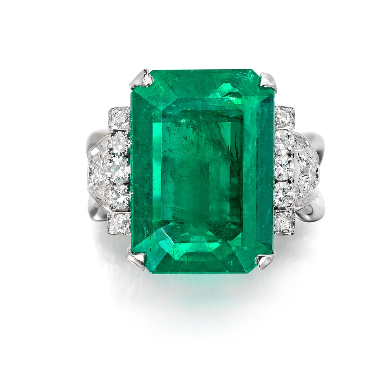 Set with a rectangular step-cut emerald weighing 13.91 carats, accented by circular- brilliant-, and single-cut diamonds, mounted in 14k white gold, size 8.5.