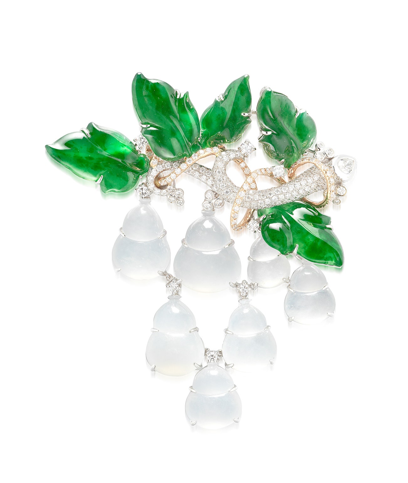 Designed as a stylized vine, set with carved jadeite leaves, of emerald green colour with good translucency, accented with brilliant-cut and pear-shaped diamonds, suspending eight hulu jadeites, of colourless with very good translucency, spaced by brilliant-cut diamonds, mounted in white gold and pink gold.