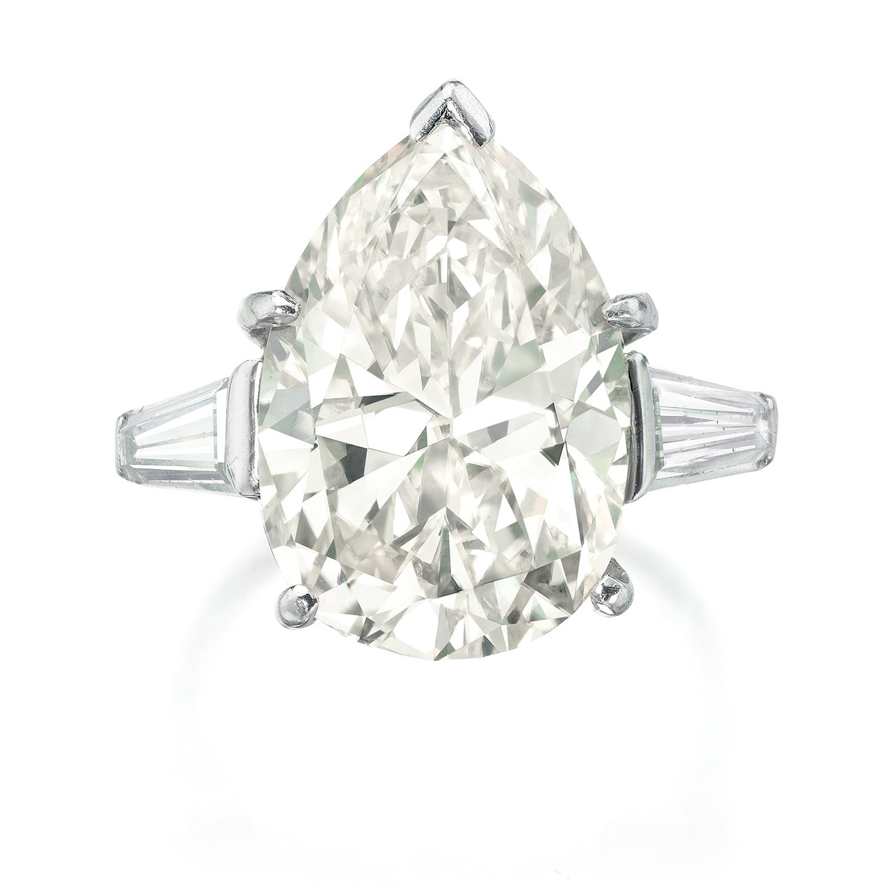Set with a pear shaped diamond weighing 7.44 carats, between tapered baguette diamond shoulders, mounted in platinum, size 4.
