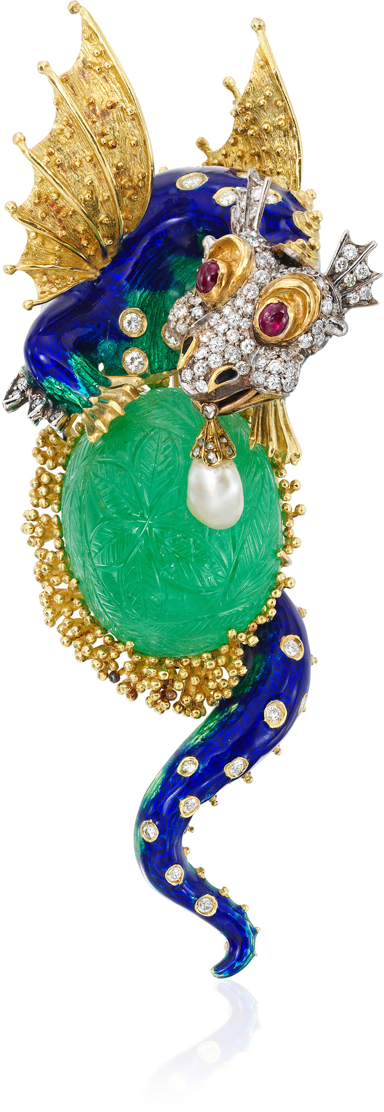 Designed as a dragon with brilliant-cut face and spots, enamel body, cabochon ruby eyes, guarding a carved oval cabochon emerald, and suspending a pearl set with rose-cut diamonds from its mouth, mounted in 18k yellow gold.
