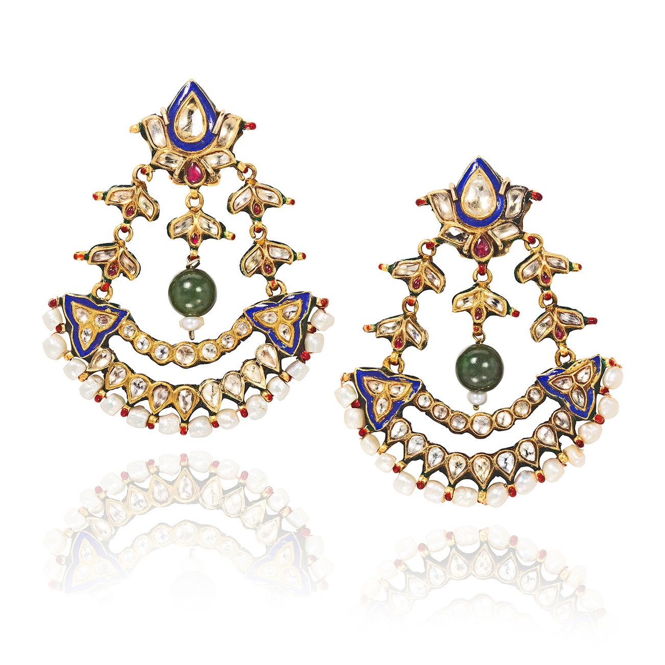 Of Mughal-style, set with rose-cut diamonds, accented by cabochon rubies, seed pearls, and a jade bead drop pendent, mounted in 14k gold, posts with hinge back fittings.